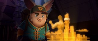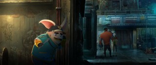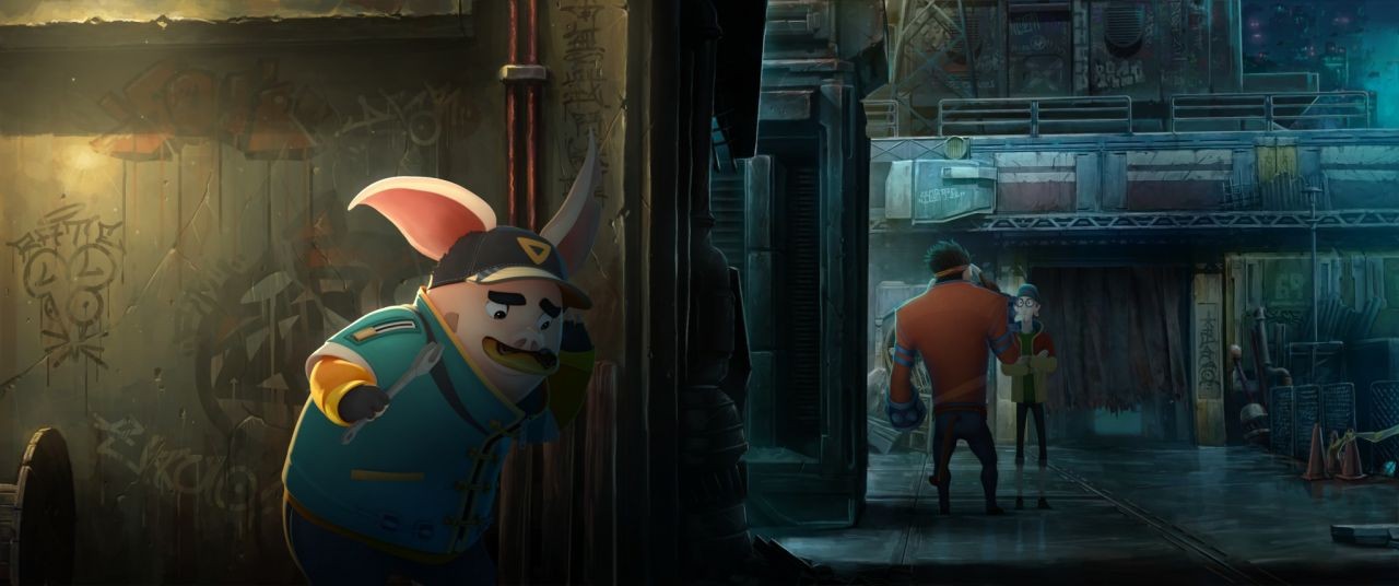邱立偉:場景比《小貓巴克里》大上許多倍,舊城區因老舊而不斷更新,但耗費了大量資源。於是上級單位決定放棄修復,直接打造「新世界」。 這有點像 iPhone 6,沒辦法更換零件也不再支援系統更新,我們索性直接做新的 iPhone。舊城區的設計方向是擁擠卻活力的場景,保留一些舊時代的物件,包含建築物或窗戶造型,也參考一些眷村的設計。團隊還在電影中打造一套稱為「精靈文」的未來文字,對比在舊城區裡看到的漢字、日文字。精靈文匯集了亞洲文字形狀,包括日文、韓文、中文、印尼文和印地文。