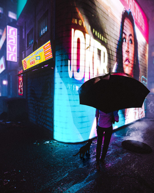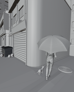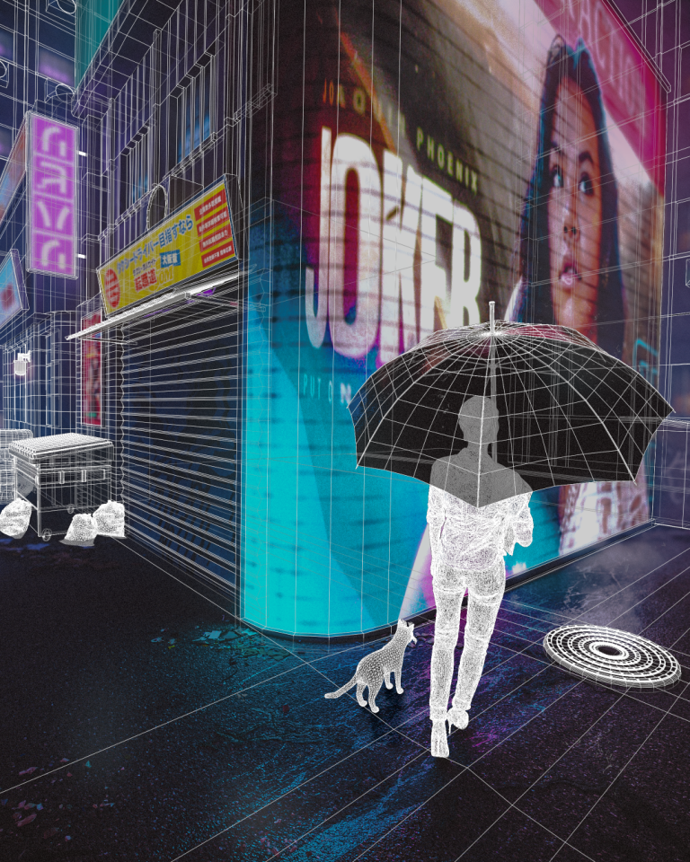 Louis Lin:對我來說《Vibes》是一個有趣的作品,它呈現一條酷炫且充滿活力的街道,且包含所有我喜歡的元素。製作上,我先繪製人行道及建築物周圍的初步草圖。接著開始進行建模,在此我使用了一個技巧,在建築表面上添加平面圖像的紋理,並使用 Loop cut 製作出窗戶及牆壁。至於窗戶的部分,與建築是相同的紋理,並使用 Emission shader 及 Glossy shader 增添反射效果。捕捉現實生活的好方法就是盡可能添加更多細節,所以我在人行道旁擺置了垃圾。人行道則是使用了 Quixel Bridge 外掛程式中的混凝土紋理,以及由義大利 3D 藝術家 Dizzy Viper 製作的水坑貼圖,使其看起來更逼真。最後再透過 Photoshop 完成後期製作。製作時遇到最大的困難是構圖,我堅信燈光及構圖對創作來說十分重要。前期製作時並沒有好的燈光及構圖,使我內心十分焦急。但當我添加 LED 板時,自然而然地得知該如何讓此作品恢復生機,是過程中十分重要的轉折,最後使我順利完成作品。