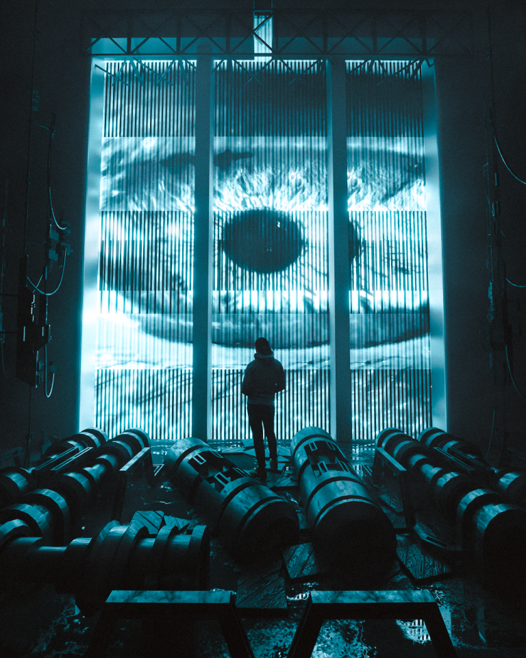 Louis Lin:《Watched》是受到《愛 X 死 X 機器人》中《冰河時期》的啟發,其中某個場景有一隻大眼睛在地平線上注視整個城市,我想創造類似的概念,只是風格較為科幻,並使用更多的燈光效果。首先我以眼睛圖像做了一個類似螢幕的平面,並以自發光材質製作。接著我以波浪紋理混合了 Glossy shader,製作出很好的反射效果。在製作上遇到的問題則是如何以「透視」想法創造一個完整的環境,並使它變得有趣。我不希望前景過於分散注意力。除此之外,我認為燈光在作品中也扮演著重要的角色,它能讓觀眾知道該關注什麼。