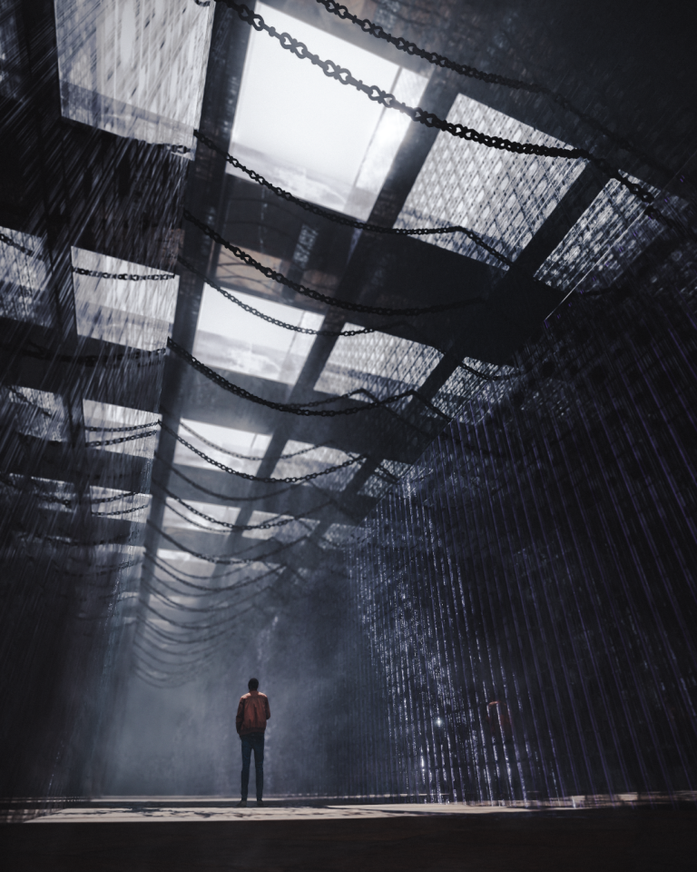 Louis Lin:在製作此作品時,我希望它看起來有點抽象,但同時也具備一個好的氛圍,讓觀眾有種迷失的感覺。牆壁的製作非常簡單,利用具有置換貼圖的 Metallic shader 來製作。接著在頂部透過 Volumetric shader 製作出有霧狀外觀的立方體。一開始在製作時,燈光是一大挑戰,因為得避免過度曝光。我需要適量的光線從頂部進入,以形成作品想呈現的燈光。最後我以太陽光製作,並使用方形區域燈透過天花板縫隙照射下來。