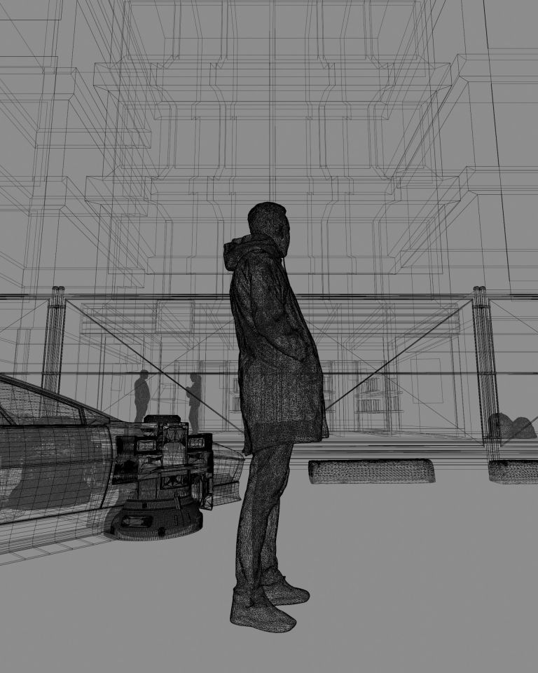 Louis Lin:一開始只是想為一間漂亮的便利商店建模,結果不知不覺就延伸成一個完整的概念藝術。我在商店周圍及頂部放置了一些模塊,並添加了角色與極具未來感的汽車。特別分享地面紋理的部分,當時我想製作一個雨天的場景,我一開始是以 PBR 作為主要紋理,直到我混合了一些水坑貼圖適應地面的粗糙度後,作品才變得更栩栩如生。在此作品中遇到的挑戰是構圖,在沒有任何計劃的情況下製作作品,對我來說十分困擾。隨著更加關注在 layout 及構圖上時,最終順利完成,但我認為如果能規劃地更好,成品的效果可能會更好。