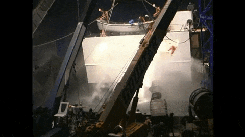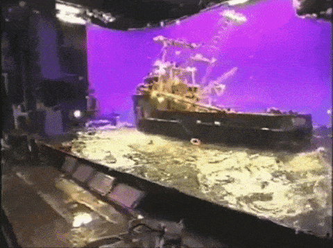 John Frazier:當時他們在華納兄弟片場選了一個最大的攝影棚,然後直接在裡面建造了一個大水缸。就當時而言要在水裡下放置一個運動平台是非常不容易的,那艘船重 150,000 磅(約 68040 公斤),加上我們必須要有個轉盤讓船可以 360 度旋轉,更別說水缸還有 20 英尺(約 6.10 公尺)深!我們偶爾還要把水放乾,看看有沒有甚麼問題需要修理的,這通常得花上不少時間。