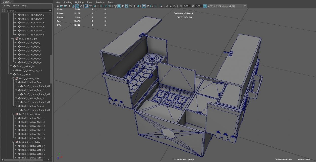 3D 美術_張語洵:遊戲引擎使用 Unity 製作,另外 3D 製作上遇到最大的困難點我認為是密盒製作的部分,因為引擎中的密盒並不是用骨架去控制,而是用層級去分類好每個機關的部位,再用程式去控制,所以在製作密盒前就必須確定好它的所有流程,才有辦法規畫好它的物件分層。