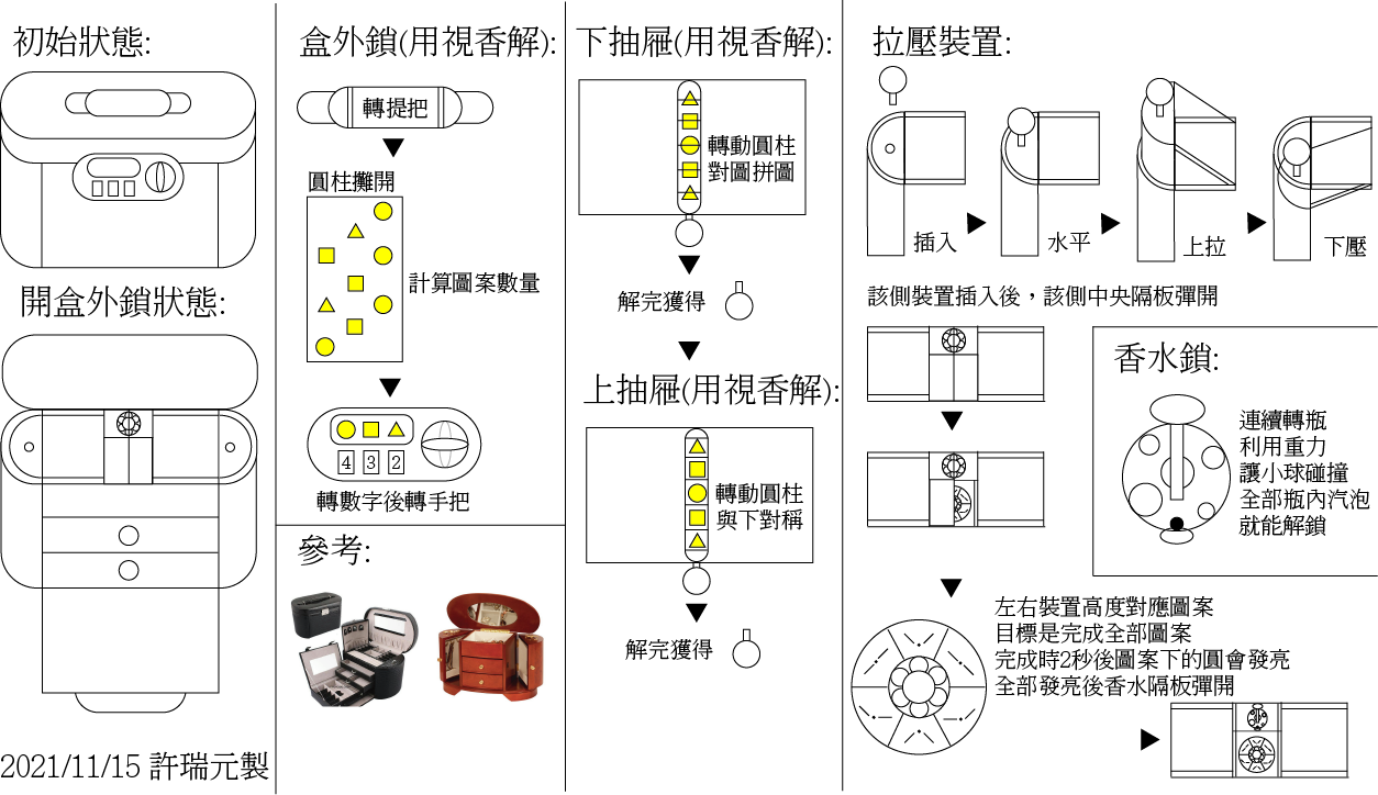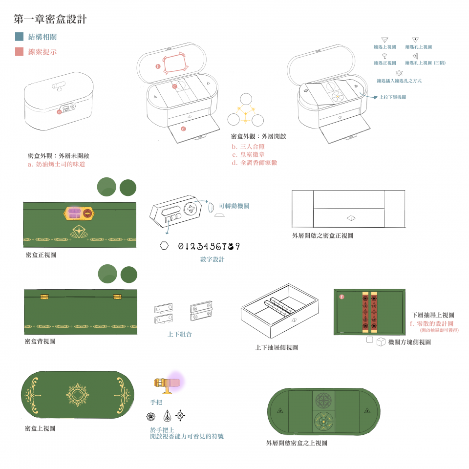 美術_比頭:關卡美術(密盒、香水等)大約花了兩個多月設計,由於希望讓密盒在場景中更加突出且具有特色,所以在前期花了較多時間思考及嘗試,最終才決定以素色加上花紋來呈現。