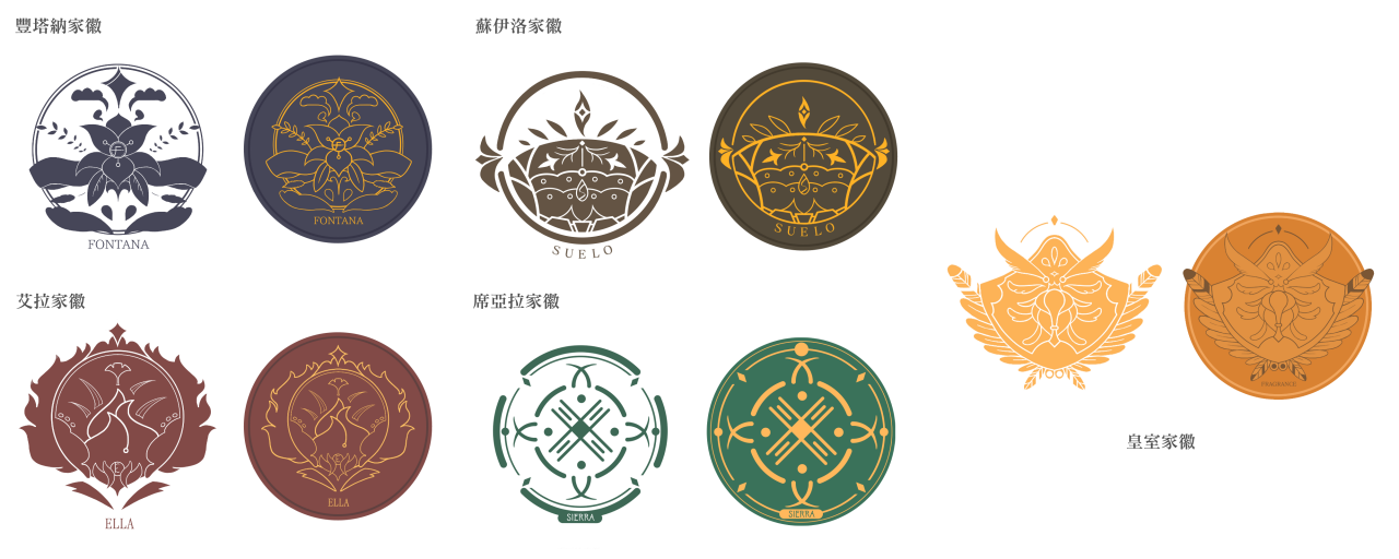 企劃_阿朴:劇情部分決定了調香師有三大家族後開始設定細節,每個家族的名稱都有特殊涵義,同時代表火、水、土壤。例如豐塔納家族 Fontana 一詞來自於西班牙語的「泉水」、「噴泉」之意,豐塔納的家徽便是搭配豐塔納家族的象徵花百合去設計;艾拉家族 Ella 在日耳曼語中可解釋為「火把」、蘇伊洛家族 Suello 則同樣是西班牙語中的土壤,最後結合這些特殊涵義與家族象徵去設計出屬於他們的家徽。