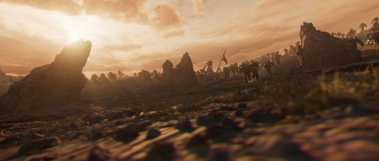 在如此規模的場景光影設計中,Alireza 透露約有 70% 的光影是在 3ds Max 中的 Arnold 算圖引擎完成的。藉由Arnold,他能夠精確控制場景中光源的角度、強度與色溫,營造出富有戲劇張力的黃昏氛圍,並確保整體氛圍的一致性。剩餘的光影細節則在後製階段進行強化,他使用 Nuke 進一步合成光暈、空氣散射及微粒效果等視覺元素。他補充道:「這樣的做法能讓最終畫面更加完整,整體質感也更為精緻。」