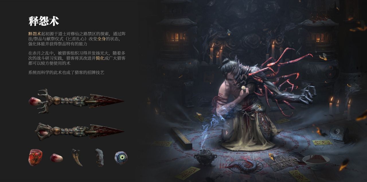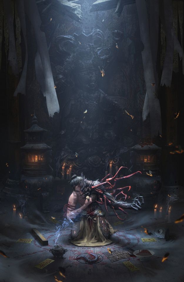RX:畫面描述的是一位道長,在修仙的道路上意外發明了一種禁忌的咒術:將毒物通過過儀式和陣法與自己身體結合,以強化自身能力;當然角色本身也會根據咒物的不同,而有不同咒物的特徵和能力,比如這幅創作中的咒物就是蜈蚣。