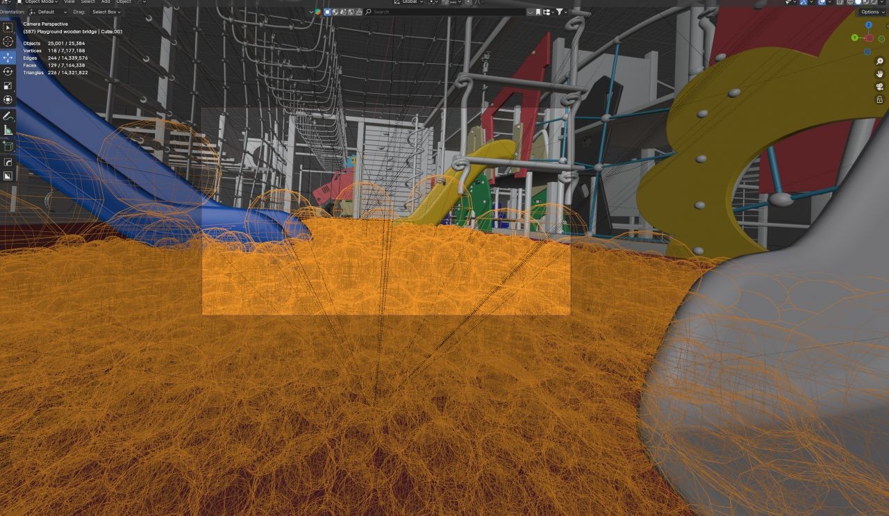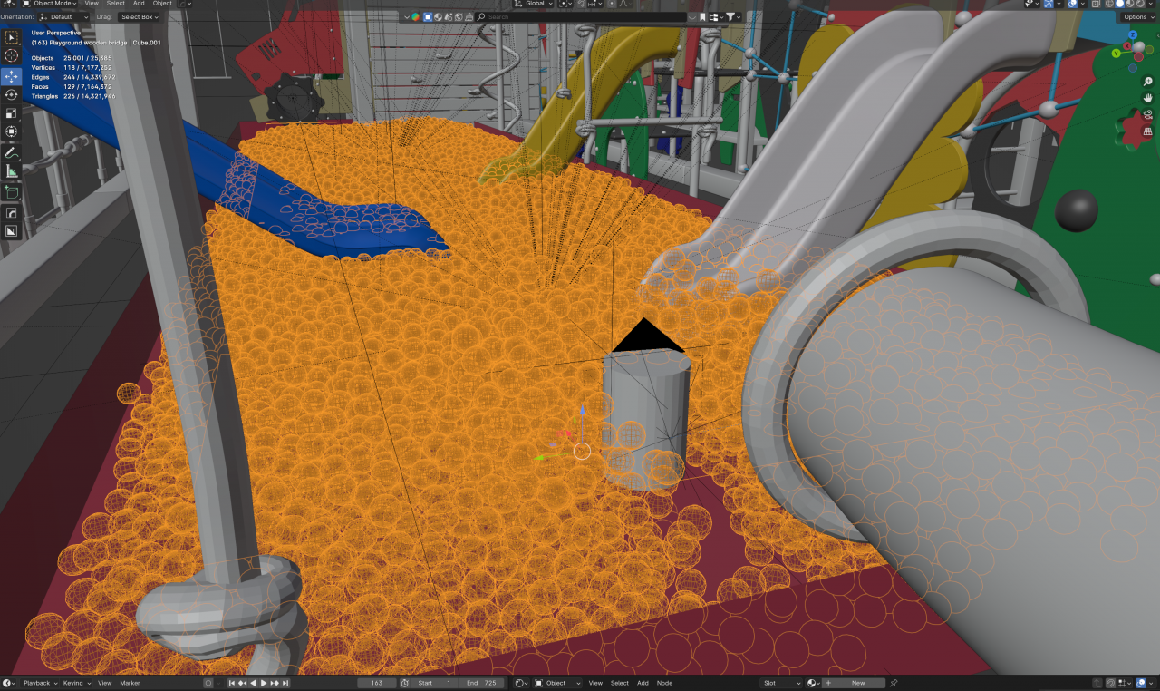 穿過隧道後,首先映入眼簾的是一座巨大遊樂場,內部除了設有溜滑梯與攀爬架等設施,球池的彩球更是多到「球山球海」。隨著鏡頭移動,POV 與成千上萬顆彩球產生碰撞,使其如同海浪般向四周散開,畫面極具動感。為了處理如此大量的 3D 物件,「物理模擬」成為莊水最大的挑戰,他坦言:「雖然我經常使用 Blender 創作,但物理模擬卻不是特別擅長的領域。幸虧前期找到了能實現碰撞效果的外掛 RBDLab,經過多次調整優化,最終才讓我實現理想中的效果。」莊水透露,儘管這段創作過程面臨了諸多挑戰,卻也讓他備感成就。