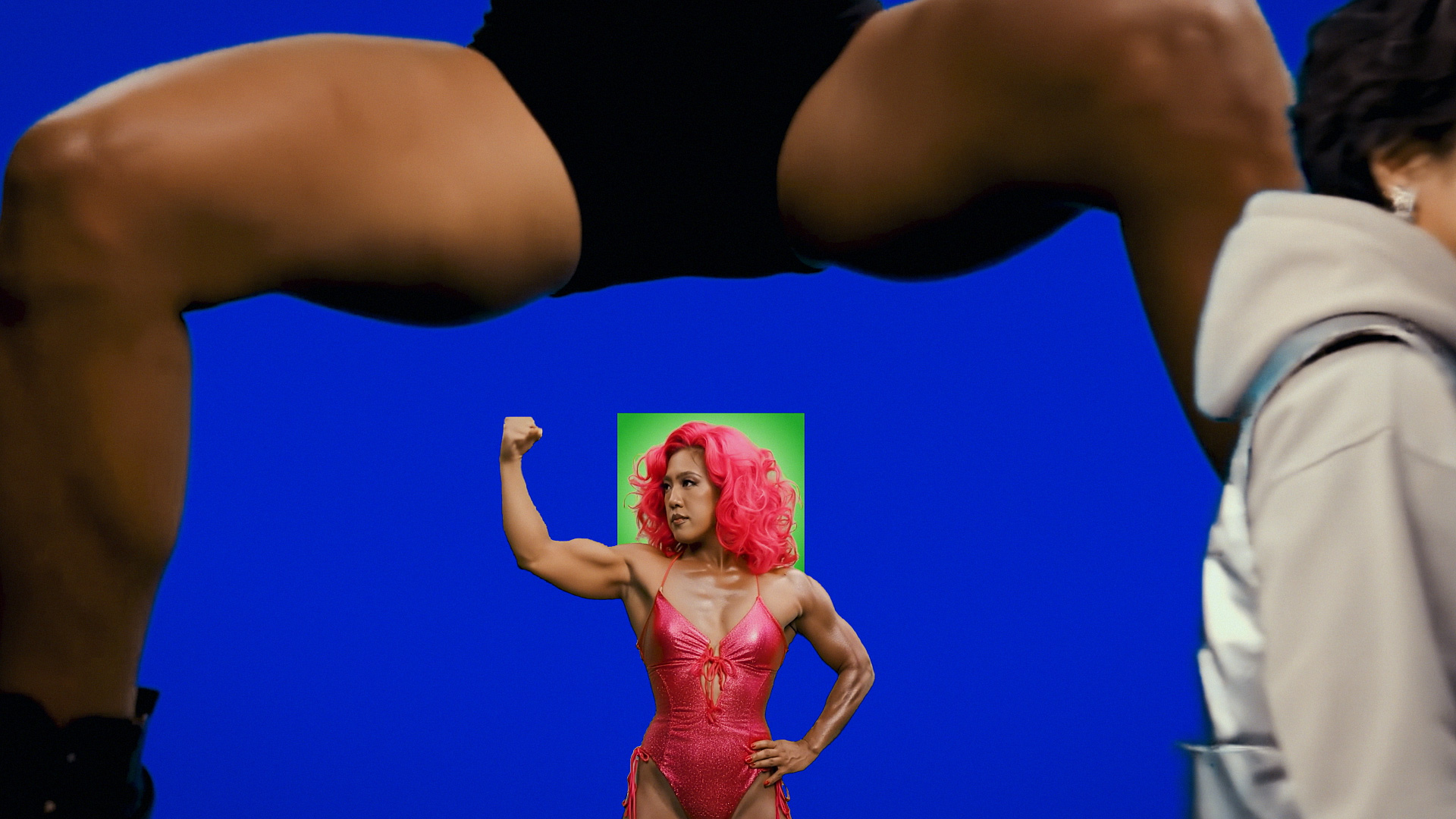 MV 中李竺芯呈現的藍臉紅唇形象,是在前期階段就已確立的視覺方向。「我們在製作初期就設定了許多風格,包括她的膚色。」團隊曾嘗試過藍色與橘色,最終選擇以藍色作為主要基調。