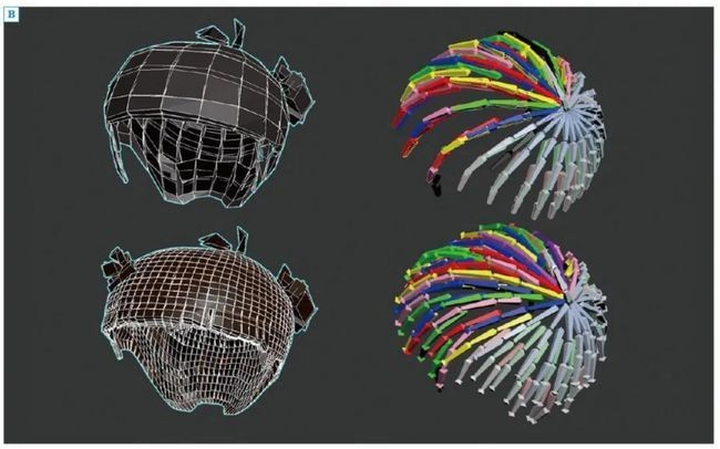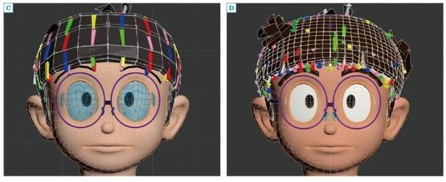 再來觀看模型和綁定的幕後圖,下排為《STAND BY ME 哆啦 A 夢 2》的模型和綁定。不管頭髮多亂,最後都要恢復到原來的狀態。為了更自然、更真實地控制頭髮,第二部中的骨骼數量比前作增加了30個。控制頭髮的網格其實很難進行詳細的設置,所以團隊創建了一個工具可以適當地進行分散。而毛髮的數量也增加了三倍,讓最終的畫面表現與質感都有了大大的提升。