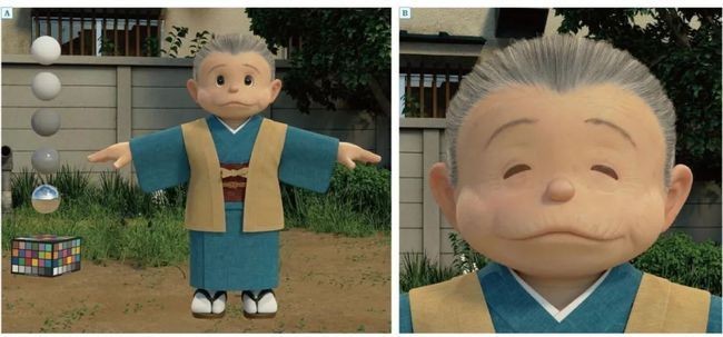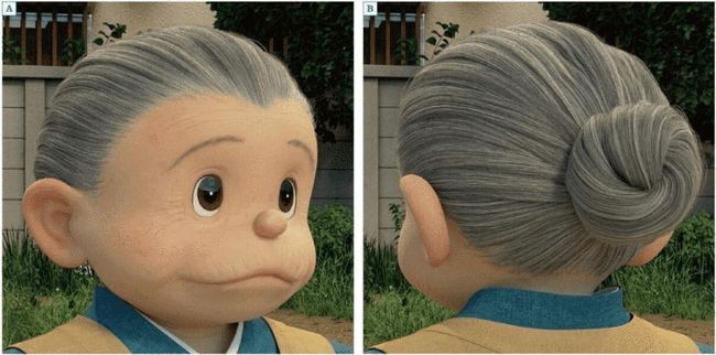 故事中奶奶設定於 60 歲,算很年輕的,因此要給她多少白頭髮也成為了一個問題,最後團隊決定將頭髮顏色劃分為深灰色和淺灰色,來減少不協調的感覺,從左圖我們可以看出來,髮際線也進行了模糊的處理。而且奶奶是長頭髮,從右圖我們可以看出來,通過這兩種顏色的搭配,即使把頭髮紮起來,從側面或者背面看也不會顯得很奇怪。