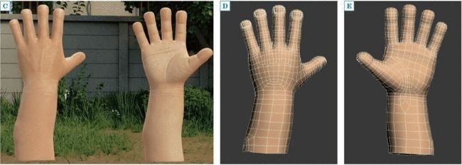 另外,本來團隊想通過在奶奶的手上添加更多皺紋以此來展現更多細節,但是由於形狀非常多變,就算添加了很多逼真的皺紋也會給人一種不舒服的感覺,且數量很難調整,所以最後就沒加太多。從下方圖片來看,奶奶的手有適度的皺紋,同時我們還可以發現變形與現實之間的界限,還可以看到背部和手掌的網格結構。