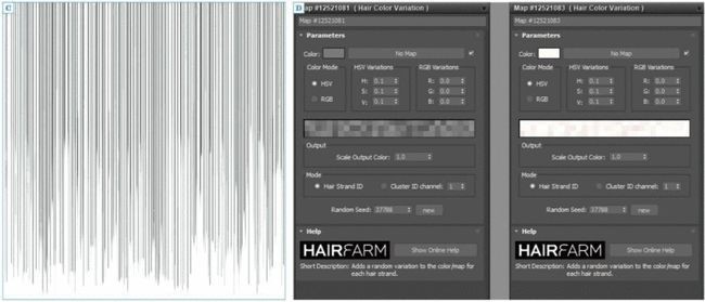 再來看看下面的圖片,可以看出製作團隊創建了多種類型的紋理貼圖,可以根據頭髮的長度改變顏色。縱軸顯示黑色開始的位置,頂部是頭髮的尖端,底部是根部顏色。髮際線為白色,設計為從頭髮中間變黑,圖中縱軸為白色的地方,就變成了簡單的白髮。再來還能看到設置,通過 Max 中的 Hair Farm 的 Hair Color Variation 相結合而製作出來的。