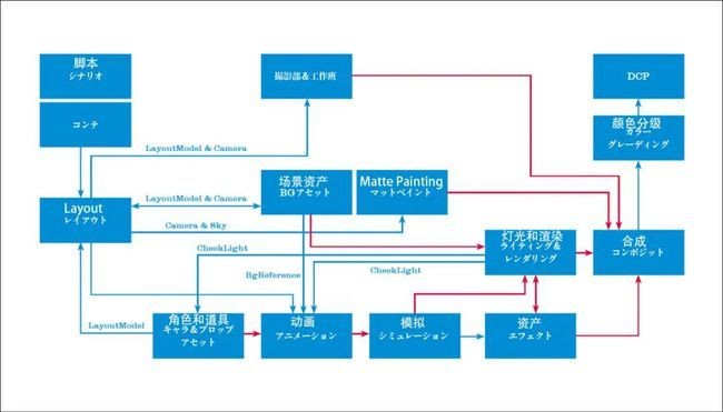 工作流程從場景和 Layout 開始。等到 Layout 完成後,依次進行角色資產的製作和上色、微縮模型的製作和拍攝等各個環節,然後再依次進行燈光和合成,從而完成作品。下圖的紅線表示數據傳輸,綠線表示參考數據的交換。