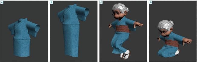 電影中最經典的一幕就是大雄趴在奶奶腿上哭的場景,但如果按照奶奶站著時的模型比例來做,這個姿勢其實是根本沒法實現的。所以製作團隊先把奶奶建模的腿拉長,並模擬試穿和服的樣子,然後再讓奶奶以坐下的姿勢,再一次模擬試穿和服的樣子。最左邊的圖是奶奶平時衣服的樣子,第二章是為了跪坐的姿勢而變形的衣服,可以看到腿被拉長了許多。 第三章是製作團隊在改造奶奶的建模中,由於改造的特殊性,避免了站立的姿勢。第四張可以看出,奶奶的姿勢更加自然。此外,奶奶走路時候的標準姿勢是把雙手交叉放在背後,這裡也將奶奶的手臂進行了伸長一倍的處理。