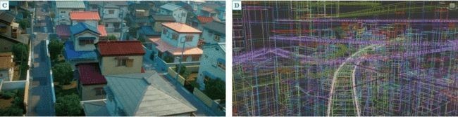 《STAND BY ME 哆啦A夢2》大家看到的都市場景實際上是第一部的四倍大, 使用 V-Ray 的 Brute Force 設置渲染的。紋理被轉換為 TX 使用,樹木使用 Forest Pack 進行離散排列。除了有6種房屋,還有還有大約 4 套公寓,通過將 5 種顏色變化應用於屋頂顏色並將它們整合在一起,再現了接近原作漫畫的城市風貌。