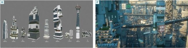 大雄和哆啦 A 夢戴著竹蜻蜓俯瞰城市的場景,是製作團隊製作了一個通用場景,可以用在所有俯瞰鏡頭的畫面上。未來的城市景觀中有八種建築模型,因為面數太大,每個模型都轉為代理進行管理。