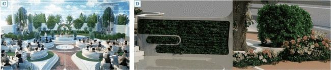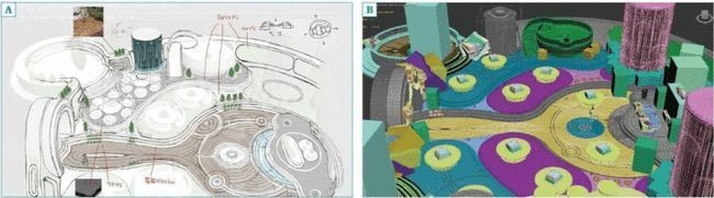 本片最重要的場景宴會廳,可以說是這部電影的重頭戲。既然是重頭戲,那場景的精細和質感必然是最高的, 這個婚宴會場可以說是整部電影中最難處理的地方了,A 圖是設定圖,B 圖是模擬場地,C 是最終成品。我們可以看到每桌大約坐了 3 到 6 個角色,總共加起來起碼有 60 個人。桌子上還放著各種食物和小道具,甚至還有一個噴泉。此外,從 D 圖中我們可以看到,場景中的許多植物也是以模型而不是紋理的形式排列出來的。隨著故事的展開,還會有風吹動植物的場景。而且就連人物腳下的草坪都是實模的,但是由於機器的容量太小,一開始連渲染都出不來,後來通過減少相機中看不見物體來減輕渲染的壓力 。