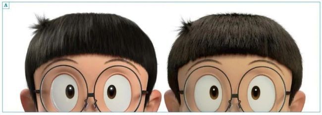 不僅是人物的造型和表情,這次在頭髮的製作上也有了很大的進步。從前作到《STAND BY ME 哆啦 A 夢 2》,製作團隊一直使用的都是 3ds Max 中外掛 HairFarm ,主要是因為可以用 V-Ray 一起渲染出圖。而製作前作時還只能單獨渲染 。下圖左邊是第一部,右邊是第二部,是不是一眼就能看出來質感有所提升?左邊的頭髮實在是太規規矩矩了,而右邊這種稍微有點雜亂感的,則會顯得更加逼真,表現力也大幅提升,比如可以看到從背後透出頭髮的光線。