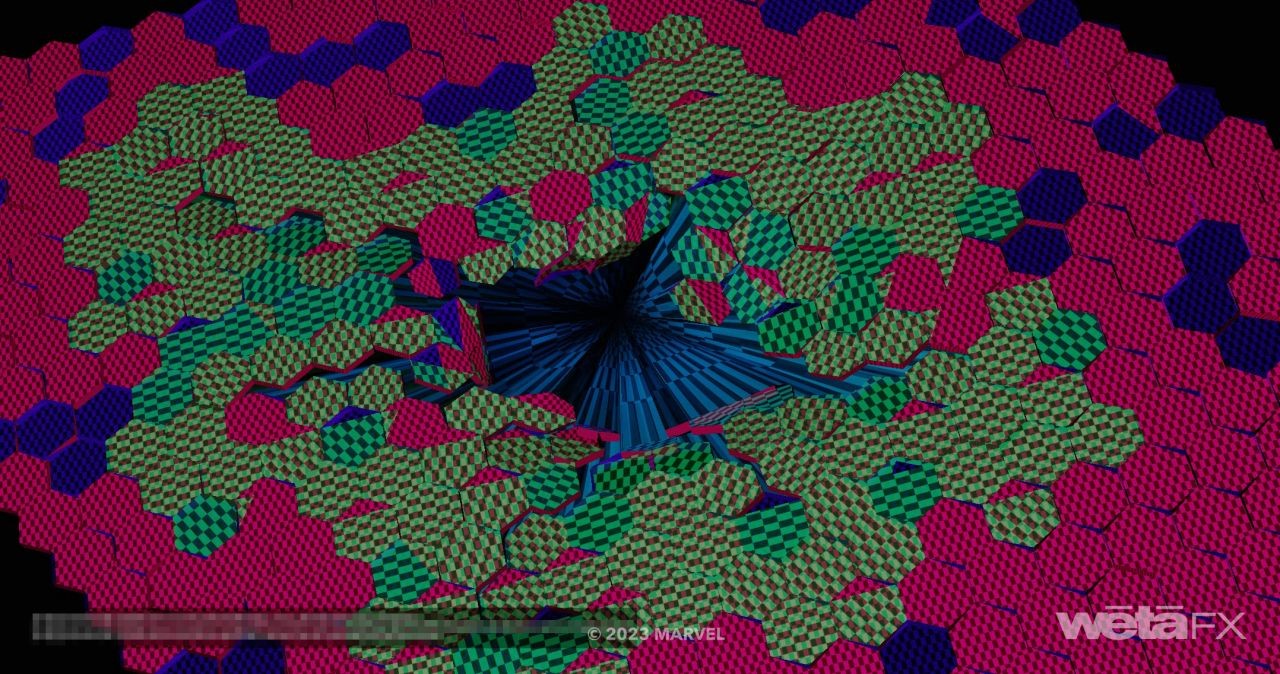 Sabine:挑戰有非常多,而且也分成各式各樣的面向,包括疫情爆發所帶來的製程延長、跨地合作等等,但論過程中挑戰性最高的任務,我覺得是為第三幕的高潮動作戲發想故事與設計。我們與另一位 VFX 總監 Tara DeMarco 還有他的漫威視效團隊緊鑼密鼓地合作,動畫總監 Karl Rapley 跟他的團隊也會共同參與各種版本的 Previz,以和製作人探索更多不同的故事發展方向,而美術組則會反覆討論、設計出時空故障的最佳呈現手法。最終,這顆鏡頭成功連結正逐漸崩塌的時空跳躍點,以及反派達本誤用量子手環的畫面,並打造出將兩個宇宙交融在一起的宇宙裂縫。