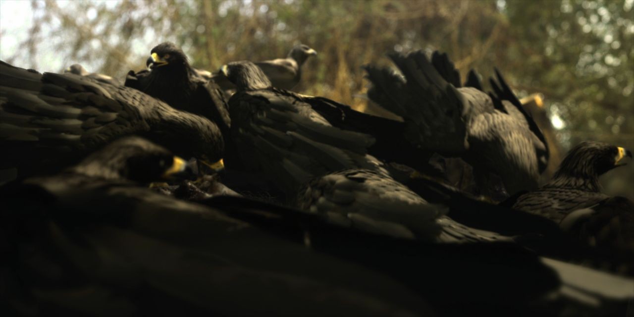 第一集〈黑鳶〉以密密麻麻覆蓋了屍坑而啄食的黑鳶開場,帶來視覺和心理上的雙重震撼。劉惟熠判斷若這場戲全以 CG 製作,真實性會不夠理想,最後由特效、特殊化妝和美術組三方合作完成。特殊化妝團隊百嘉堂與美術組製作了逼真的道具屍體,不但在為現場拍攝加分,也讓後期特效更順利。劉惟熠分享,當中最難的部分是導演希望拍出黑鳶啄食屍體上的爛肉,他們先請特化做出假的腐肉,工作人員戴著藍手套,用鑷子去撥動腐肉,後期再把手替換成黑鳶。「鳥吃東西會先啄一下,放開,再叼回來,所以這名工作人員也需要模擬啄食的動態節奏、力道。」