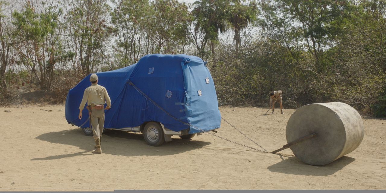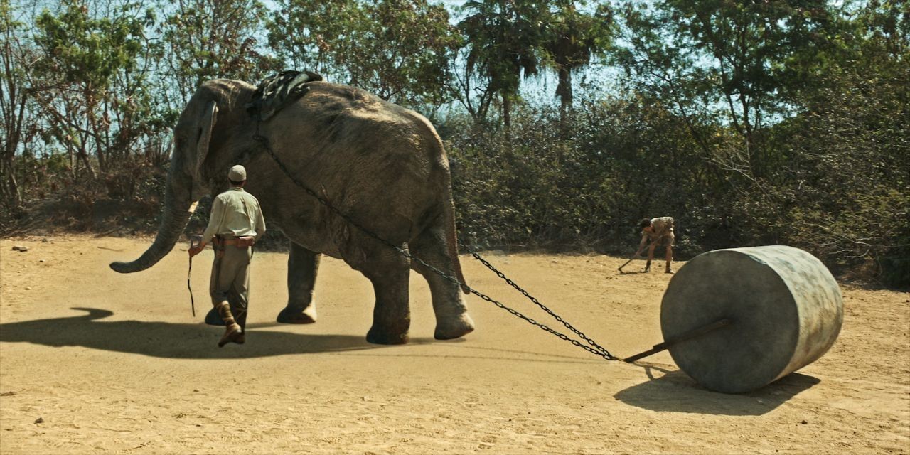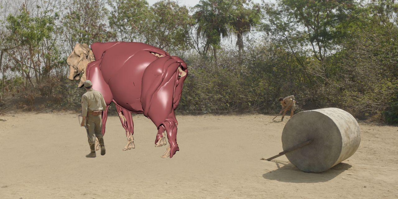 二戰期間,強壯耐操的大象是東南亞軍隊中相當重要的資源,木柵動物園的明星大象林旺起初便是在緬甸為日軍服役的工作象。在《聽海湧》中,臺籍戰俘監視員利用大象整土建造停機坪。然而,要如何讓 CG 大象拉動重達五百公斤的水泥滾輪?拍攝現場又該如何執行表演?特效團隊最後想出辦法,在小發財車外罩上藍幕,讓演員可以和大小、高度近似的對象互動,發財車也能拖動美術組準備的道具水泥滾輪。
