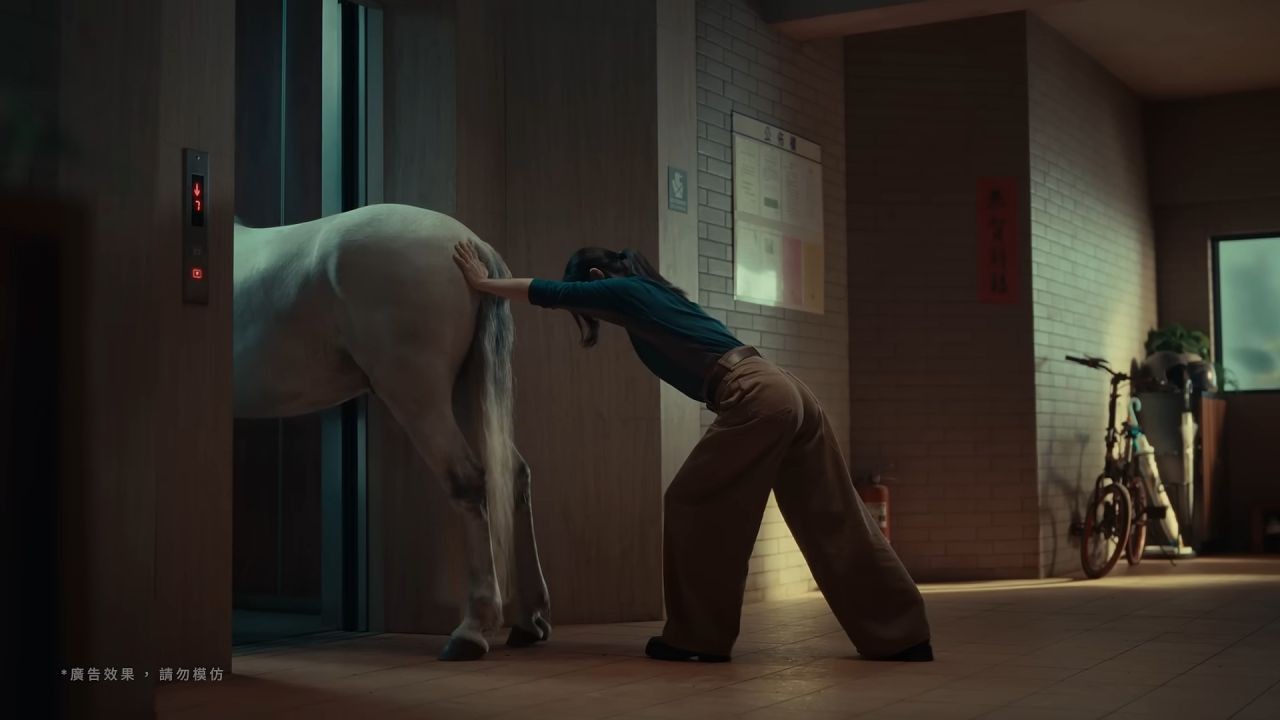 嚴振欽:廣告中白馬跳舞踢破牆的那一幕,應該是調整次數最多的鏡頭。因為客戶要求 CG 馬要接近真實馬的樣貌,但每個人對於「像」的定義都不太一樣。有人說脖子的粗細,有些人會覺得馬尾的毛色。