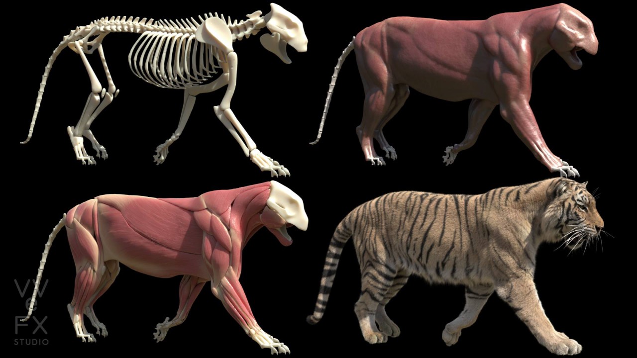WeFX 團隊以 Look Development、Rigging、Animation、Simulation 和 Pipeline 五大面項分享。在視覺開發階段,3D 建模師黃啟銘 (Kevin Huang) 提到,他的工作流程主要分成構造、建模、毛髮、材質貼圖與 Surfacing。他們搜集了許多角色的老虎頭骨、骨骼照片作為參考資料,不斷確認上下肢比例的正確性是非常重要的。他也觀察到,老虎和獅子在骨骼上其實是有差異的,像是老虎的頭骨是比較細窄,鼻嘴部份的骨骼也較長,如果沒有注意到的話,做出來的模型是會很不像的。在肌肉構造的部份,因為較難找到老虎相關的資訊,所以他們有參考了獅子的解剖圖,以及人類的肌肉結構。