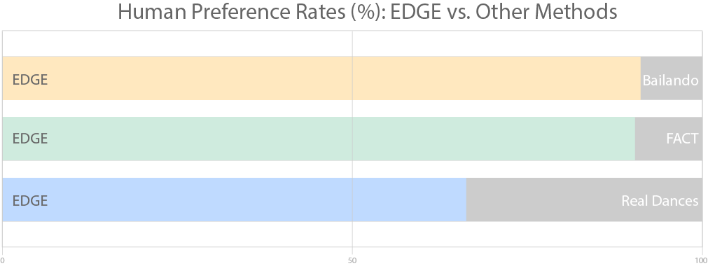 由於舞蹈中充滿著滑動腳步等複雜且有意的動作,所以 EDGE 會使用新的 Contact Consistency Loss 功能,以學習該滑動的時機,並在滑動過程中提高物理的真實感。此外,開發團隊將 EDGE 與 Bailando 及 FACT 等動作生成方式相比,發現前者的接受度高出許多。