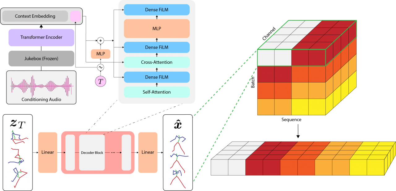 儘管 EDGE 只能生成約五秒左右的舞蹈片段,但它能透過將時間限制(temporal constraints)強制執行在一組序列(batch of sequence)上,以生成任意長度的舞蹈。下圖為 EDGE 限制每組序列的前半部分,以搭配上一序列的的後半部分。此外,EDGE 會透過 Jukebox 將輸入的音樂進行編碼,接著條件式擴散模型(Conditional Diffusion Model)會將編碼後的音樂導入進各個舞蹈片段中,並將其串聯成一部完整的影片,過程中系統還會自動調整動作和時間的連貫性。