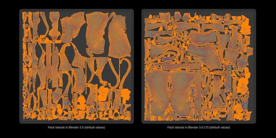 Blender 的 UV packing 引擎也推出了全方面的更新,對於存取大型網格的性能有了顯著提升。根據官方表示,將 UV 貼圖轉移到視埠(Viewport)的過程,比起以往整體快了 3 倍;同時,UV packing 的效率也加倍了,如同下方圖片的 UV layout 比較所示,左方為 Blender 3.5,右方為 3.6。
