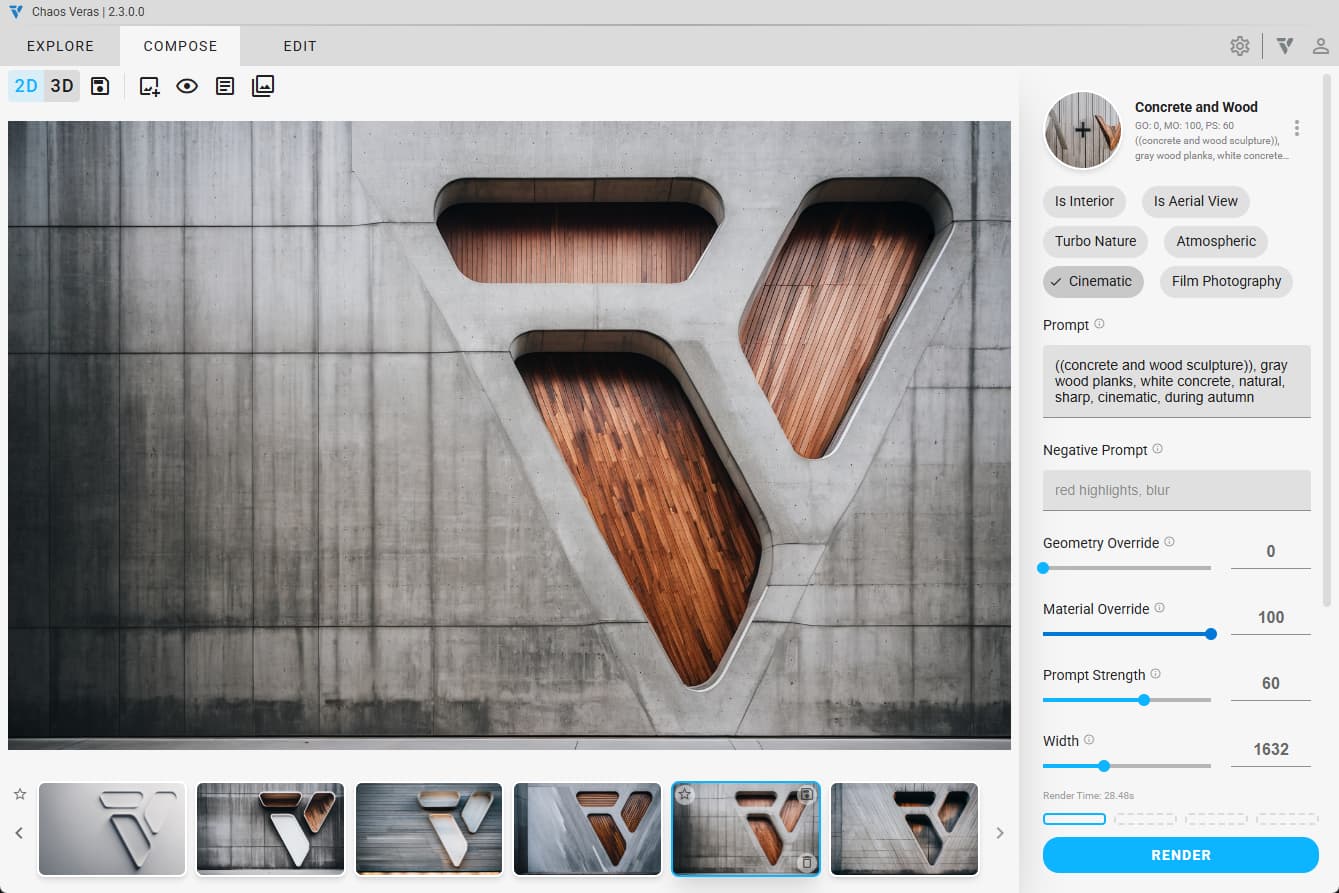 Veras 原本由 EnvolvLab 開發,並在 2025 年 2 月被 Chaos 收購,現已正式納入 Chaos 的建築設計產品線。Veras 是一款專為 AI 輔助設計與視覺化打造的工具,並直接整合於 Enscape 中,也可運用其它如 SketchUp、Revit 或 Rhino 等主流建模軟體中,協助設計師在熟悉的工作環境內快速生成設計構想與成果。