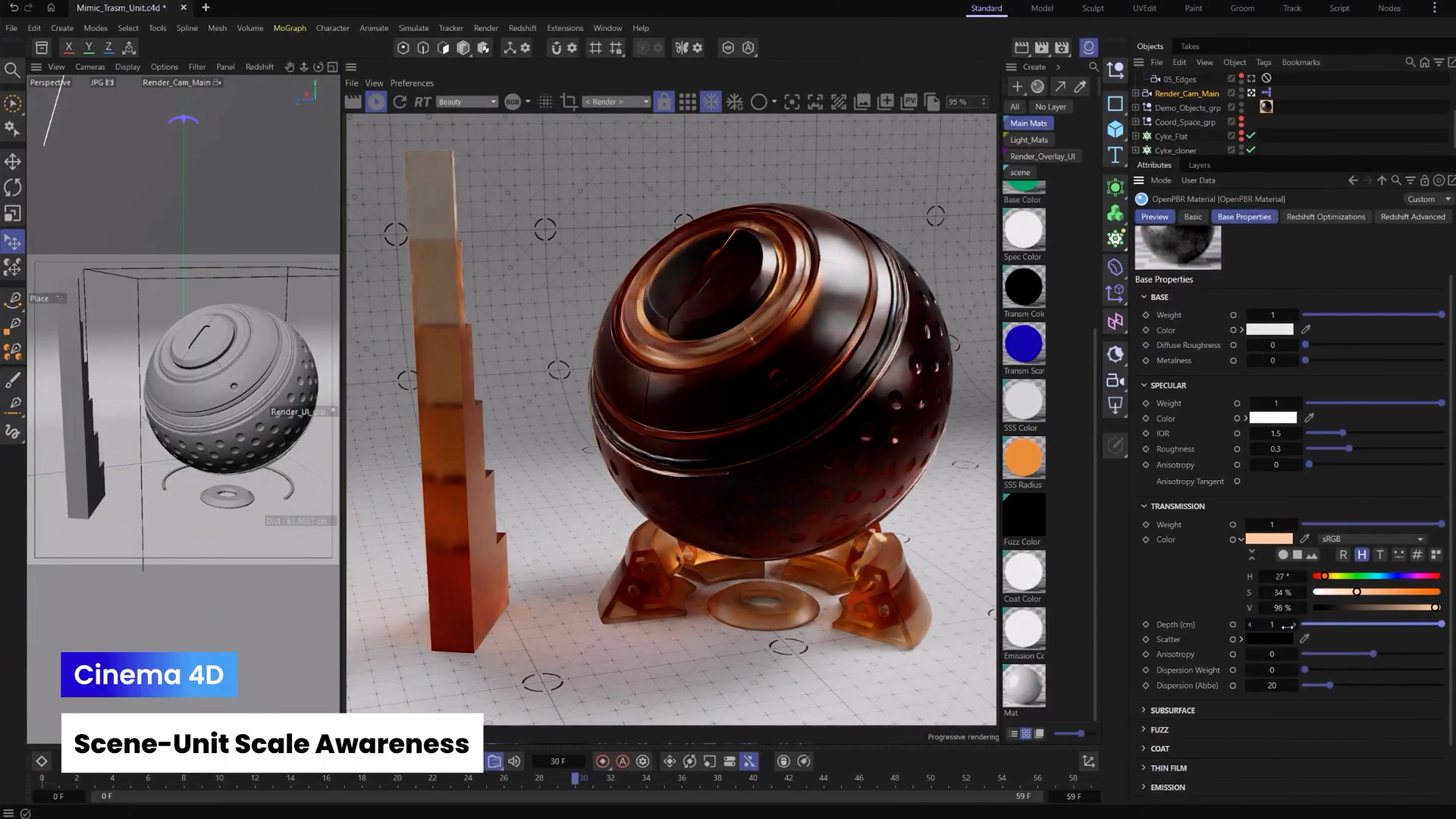 Redshift 也改善了場景單位的設定,在材質與燈光上的關鍵參數中強化的單位的顯示。可避免當場景的單位改變之後,使用者只能盲目地猜測參數的單位,確保在製作像室內設計場景時,因材質的尺寸與照明單位的不精確而影響算圖效果的真實性。