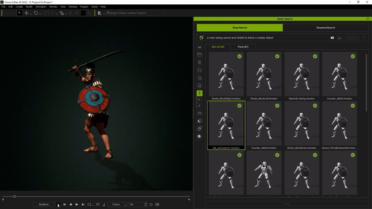 此外,也可以在 iClone 中透過 Smart Deep Search 功能快速查找素材。像是可利用自然口吻的關鍵字描述、標籤等文字進行搜尋,或是利用「以圖搜圖」的方式,上傳一張圖片後,Deep Search 即可過濾出所有類似的模型資產。最方便的是可以在場景中對物件按下右鍵選擇「Deep Search Similar」,系統會立即推薦出類似的物件供你選擇。透過上述各種智慧搜尋方式,即可快速從 ActorCore 四千多個動作資料以及將近上千個人物與道具庫中,撈取出符合需求的資料,加速動畫的製作效率。