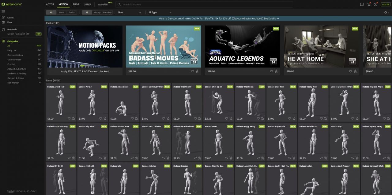 ActorCore 動作資料庫包羅萬象,從基本的單人動作、多人互動、表情、人與物件互動到卡通風格表演等各種主題都廣納其中。隨著近年來 AI 技術的發展, AEC(建築、工程與營建)相關應用與模擬也逐漸成為動作資料規劃的重要領域。而 ActorCore 中的各式生活類別動作,也十分適合 AEC 動畫中所需要的人物情境模擬使用。