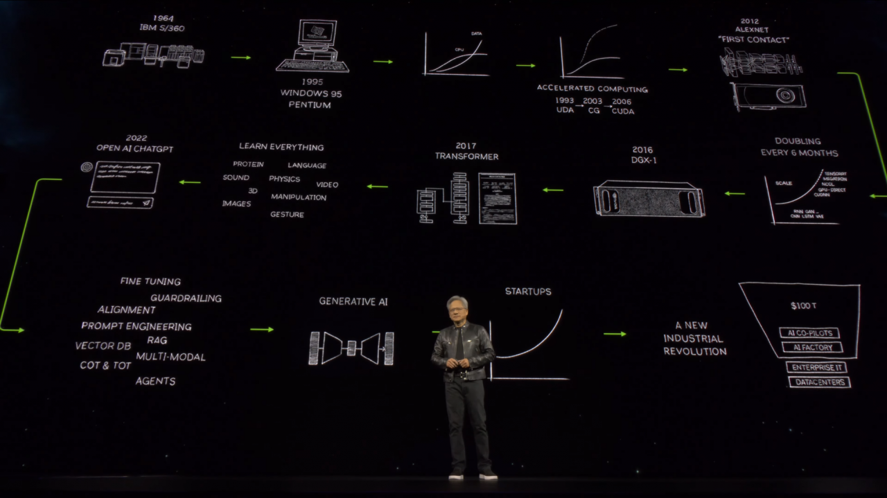 暌違 5 年, NVIDIA 的大型盛會「GTC 2024」再度以實體形式舉行,並於 18 至 21 日在美國加州聖荷西盛大展開,執行長黃仁勳也於 18日 (台灣時間 19 日凌晨 4 點)發表主題演講,以簡單的圖畫講述 NVIDIA 發展至今約 30 多年來的演進,並談論 GPU 加速運算、 生成式 AI、機器人等議題,以及 NVIDIA GPU 帶來的幫助,以下整理了此次 GTC 演講的 4 大看點,一起來看。