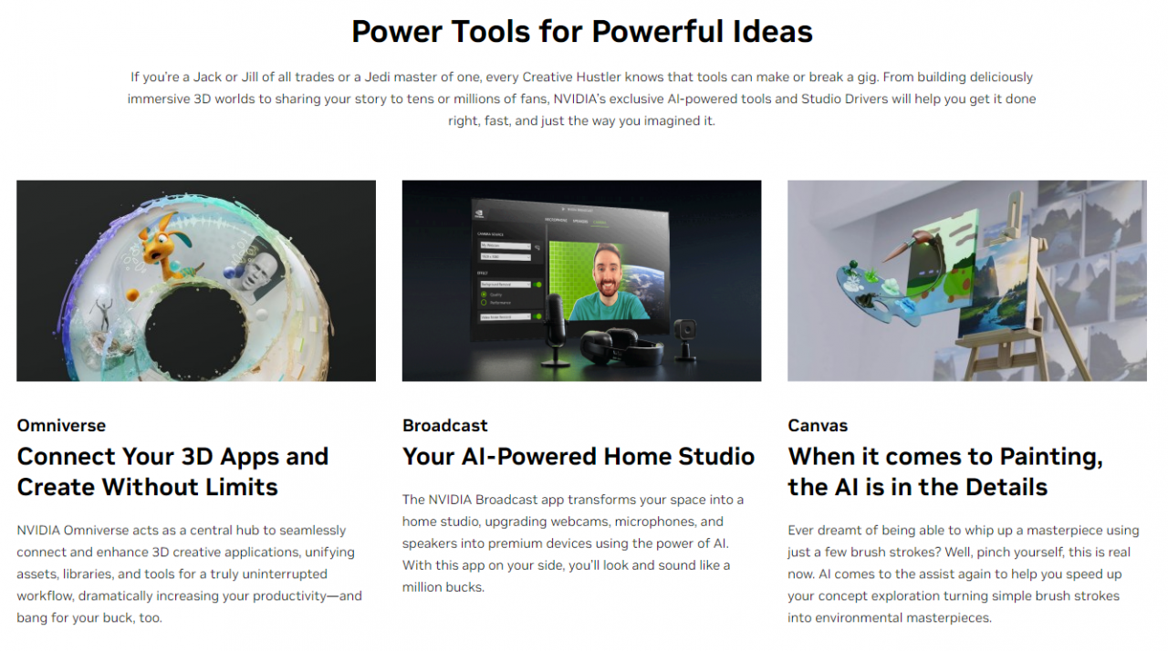 目前 NVIDIA Studio 提供的工具非常多元,譬如在 3D 創作時即能展現強大主宰力的 NVIDIA Omniverse、將網路鏡頭、麥克風、喇叭等家庭設備的輸出品質升級成工作室等級的 NVIDIA Broadcast、或透過 AI 將塗鴉轉換成逼真圖像的 NVIDIA Canvas 等等,都展現了 NVIDIA 工具的強大及實用性,相信一定能位創作者帶來非常大的效益。