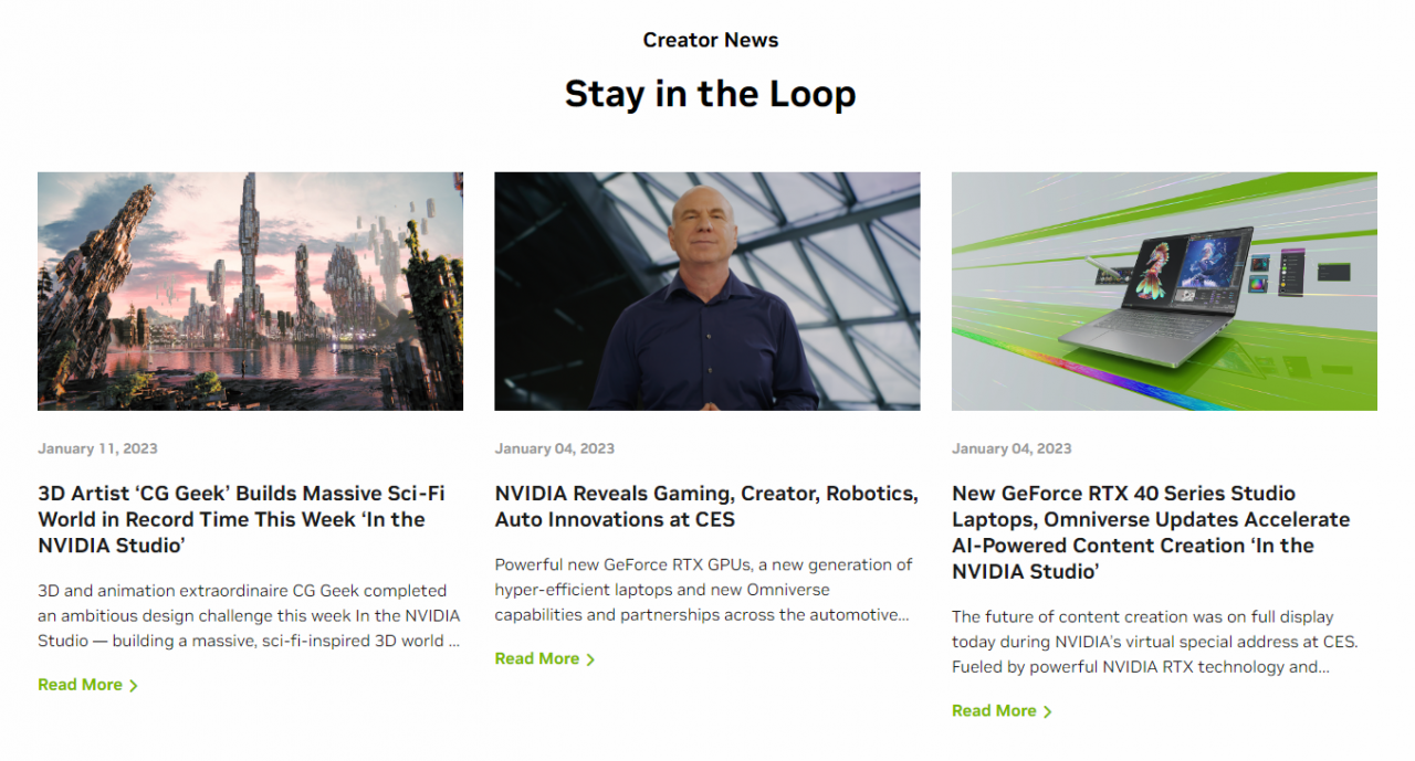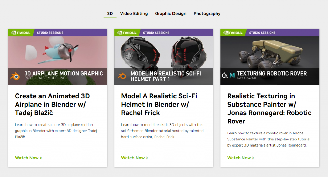 若藝術家在創作時遇到困難,有時會跑去問一些前輩,而得到的回應通常是他們自己的人生教訓;但 Creative 5-9 能給予真正意義上的教學,讓作品能得到極大的改善,對此 NVIDIA Studio 官方透露:「我們提供了數百種教學,讓藝術家在遇到瓶頸時能獲得幫助,並提升作品或自身的技術水準。」目前,平台上的教學分成 3D、影片剪輯、圖像設計、攝影等領域,且正在持續增加中。