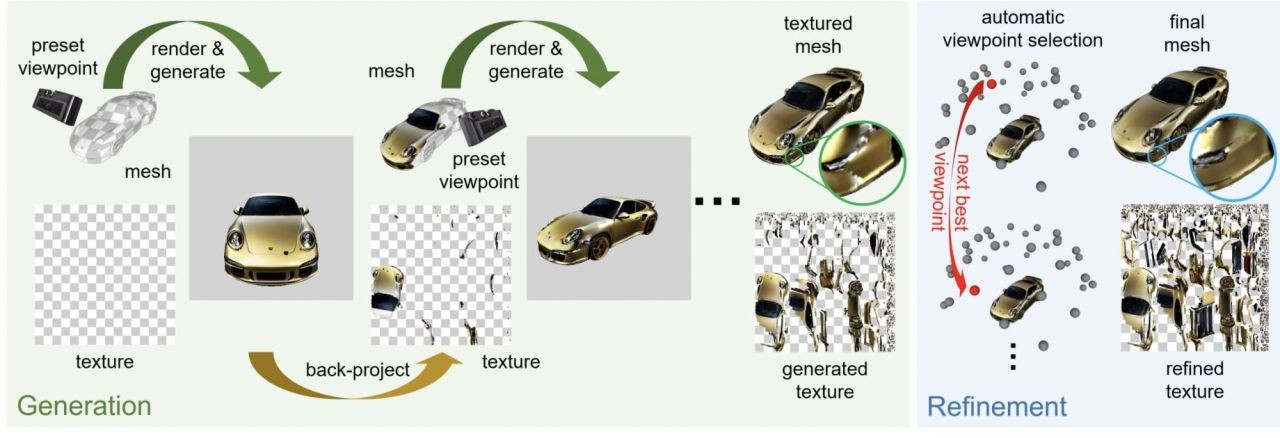 在漸進式的生成過程中,我們從初始預設視點開始算圖,利用深度圖像擴散模型生成新的外觀,並將生成的圖像投影至局部紋理。接著,我們重複這個過程,一直到最後一個預設視點,最終再輸出初始的紋理網格。在接下來的紋理精煉過程中,我們會自動選擇視點以更新初始紋理,以改善拉伸和模糊的瑕疵。