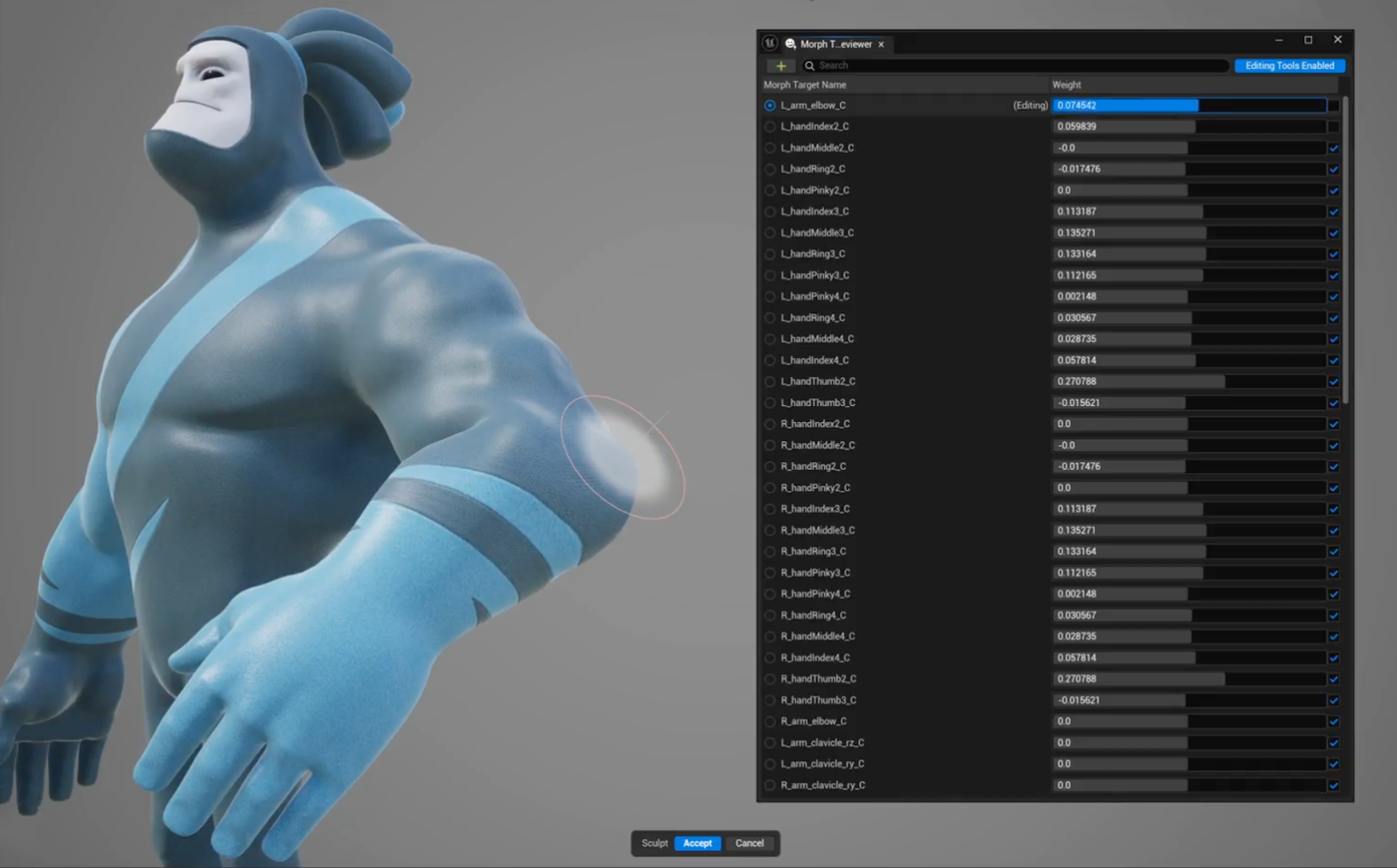 全新的 Morph Target 檢示器讓使用者可一次檢視角色的所有 Morph Target,並透過權重滑桿調整各個 Morph 的影響強度。