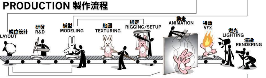 在製作流程中,綁定師與 3D 角色動畫師、模型、模擬團隊的互動十分緊密。楊顓瑋工作時,會先與 3D 動畫師討論,進一步了解他們的需求,並提供基礎測試的綁定。他強調:「初步綁定不必做到完美,因為一開始就追求完美,若動畫師最後無法使用,反而徒增製作成本。」