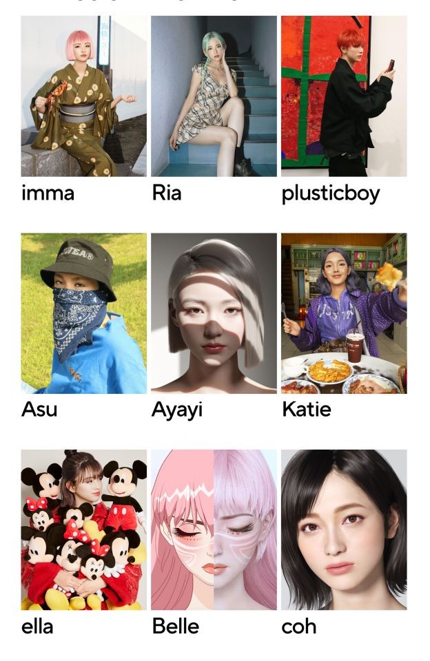 Sara:是的。所以 imma 是 Zinn(@Plusticboy) 的姐姐。而 Ria 在和 Zinn 交往。所以這些都是 Aww Inc. 原創的虛擬人物。然後 Ayayi 是來自中國,Katie 是泰國人。我們還與日本迪士尼一起創造了 Ella,這是他們的第一位虛擬人勿。而 Belle 是為日本動畫導演細田守的電影《龍與雀斑公主》(Belle),當中的動畫主角創造了虛擬人的版本,作為當時電影在 IG 上宣傳用。還有 coh,她則是與一家叫 KDDI 的公司共同開發的,這是日本一間大型的科技公司,當時想要透過這個方式來嘗試很多關於 4G、5G 傳播、擴增實境等技術的應用。