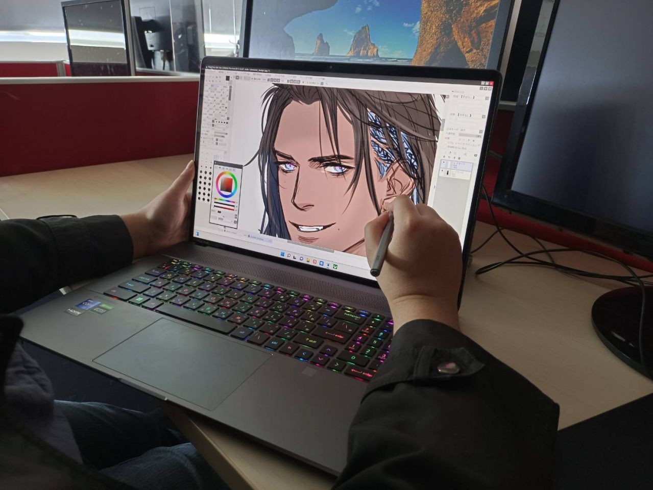 有鑑於客戶對 VTuber 風格的要求,3D 貼圖的繪製工作就成為流程中一大關鍵。貼圖顏色能夠精準呈現,對設計師是相當重要的。柯怡彣說:「我在 MSI Creator Z17 上使用 Photoshop 繪製貼圖時,螢幕呈現的色準、亮度表現相當不錯,即便在戶外或陽光較強的地方,觀看上也都沒有問題。在正常光源下的觀看體驗也都很舒適,貼圖的色澤呈現相當準確。也因為它搭載超高畫質的 IPS 等級螢幕,能呈現精準的色彩且可視角很廣,以往要和組員討論製作內容時,都不太容易看清楚螢幕畫面,但是在 Creator Z17 上,從不同角度去看都不會有色差,是滿不錯的地方。」另外,MSI Creator Z17 採用 16:10 黃金比例的觸控螢幕,搭配專屬的 MSI Pen,很適合設計師進行初步的模型設計開發,可以在短時間內做到一定程度的建模與雕塑作業,在前期設計發想時是蠻不錯的應用。