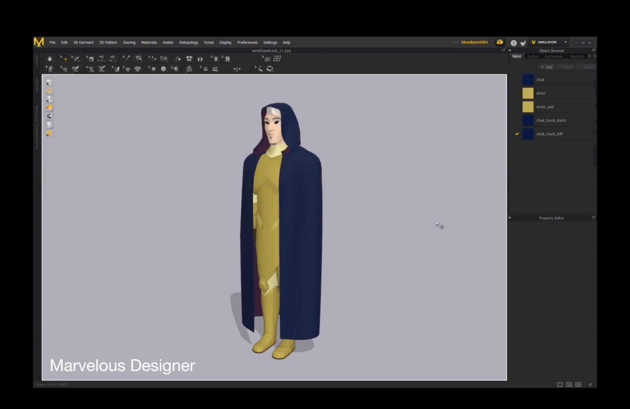 Marvelous Designer 是一個可以精準地製作服裝模型以及布料模擬的軟體,陳虔柔在進入藍天工作室後擔任「Tailoring and Simulations」,這個職位讓她首次接觸 Marvelous Designer。她會按照角色設計師所設計的角色模型進行建模,在 Marvelous Designer 中為角色打版,打造出僅供模擬使用的三角面模型。接著,她會將這些三角面模型匯入 Maya,再進一步重新建模,重新建模的模型為四角面模型,會增添更多細節,與原先的三角面模型連動。最終,三角面模型被隱藏起來,只留下較精緻的四角面模型。