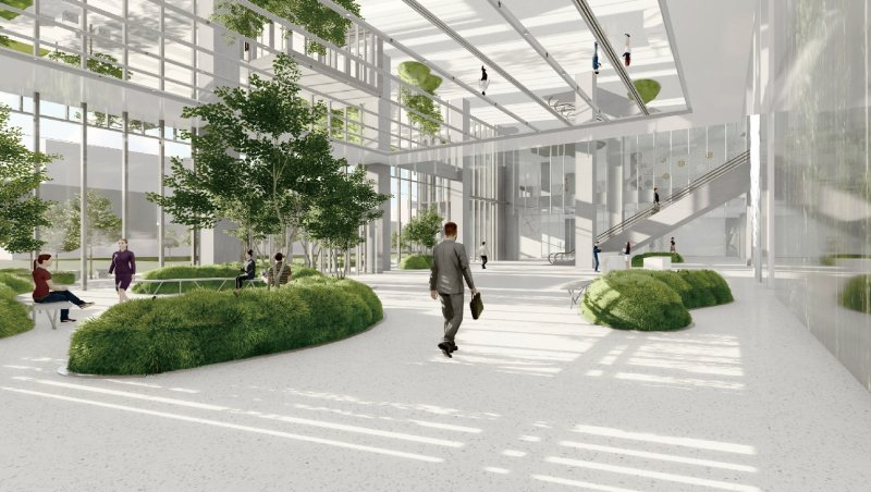 在經歷辦公室遷移以及面對本土疫情爆發後,元宏建築強烈意識到辦公室室內空間的使用,其實可以盡量避免與外來者直接接觸的機會,以阻隔病毒的傳輸途徑。為此,元宏建築將生態建築的手法和策略運用到建築規劃上,並將「中介空間」的概念加以落實。以辦公大樓為例,利用梯廳跟辦公空間的間隙,來創造出「中介」的小會議室或會客所,區隔出外來者與原室內空間使用者的接觸。吳經理說:「透過這種方式來有效降低病毒交互感染的可能性,甚至在大型的廠辦空間又有更大幅的規劃彈性。例如在新北土城的中工雲宇宙 AI 園區廠辦空間,我們甚至在公設層的屋頂規劃了戶外空中跑道,可以滿足在中工上班的人們,在空閒或下班時間可以做運動或散步,可運用的層面很廣。」