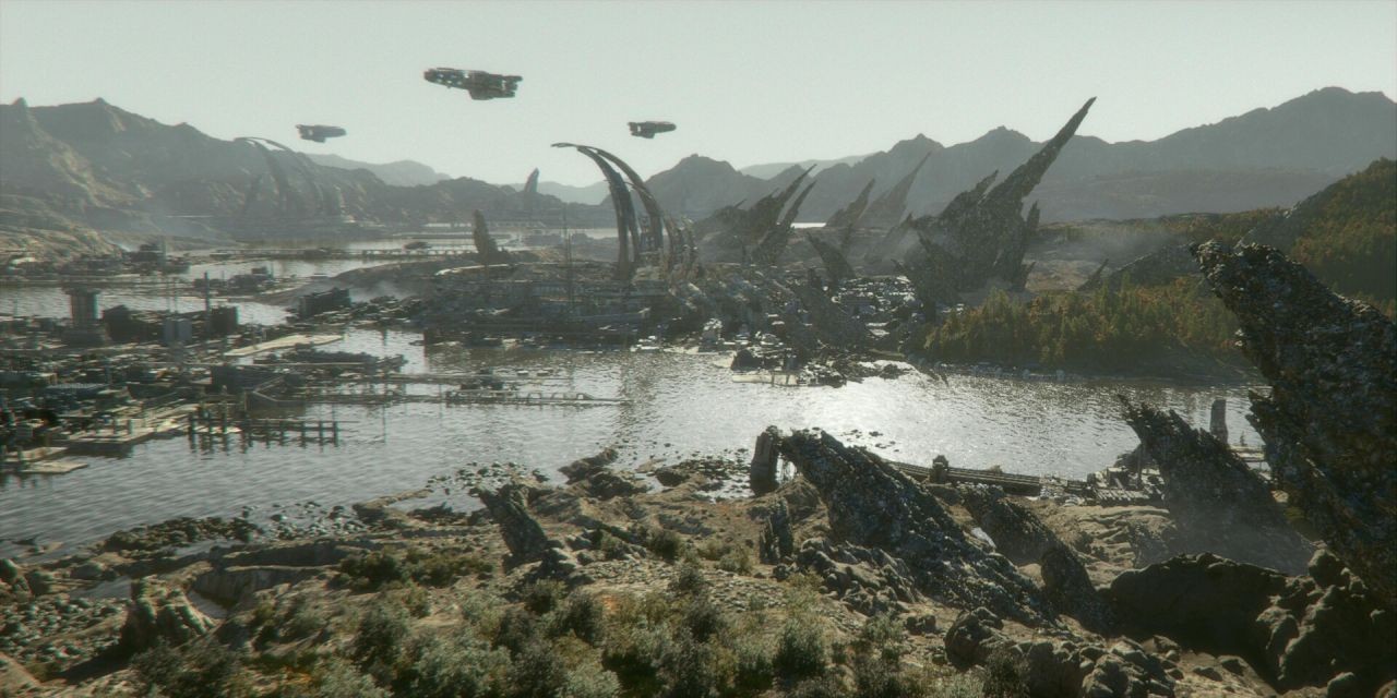 哲軒 & 佩珏:此次作品希望以人眼俯瞰工業港灣的角度為出發點,然後鏡頭由右向左平移。我們希望將畫面的重心放在左側,因此將主要建築結構、小型廠房和港口集中佈局在畫面的左側。前景的環境參考了大量的荒漠照片,發現荒漠中有小型的植物和樹叢生長,這對我們而言相當有趣。因此,這個作品參考了許多實際環境的佈局,以及如何合理地過渡到海岸。至於尖銳的巨石佈局,則相對依賴個人的創意和經驗。最後加入了一些小型飛船以更好的表現物件跟環境的比例尺,飛船的動態也較好引導觀眾的視野。讓畫面更為完整。
