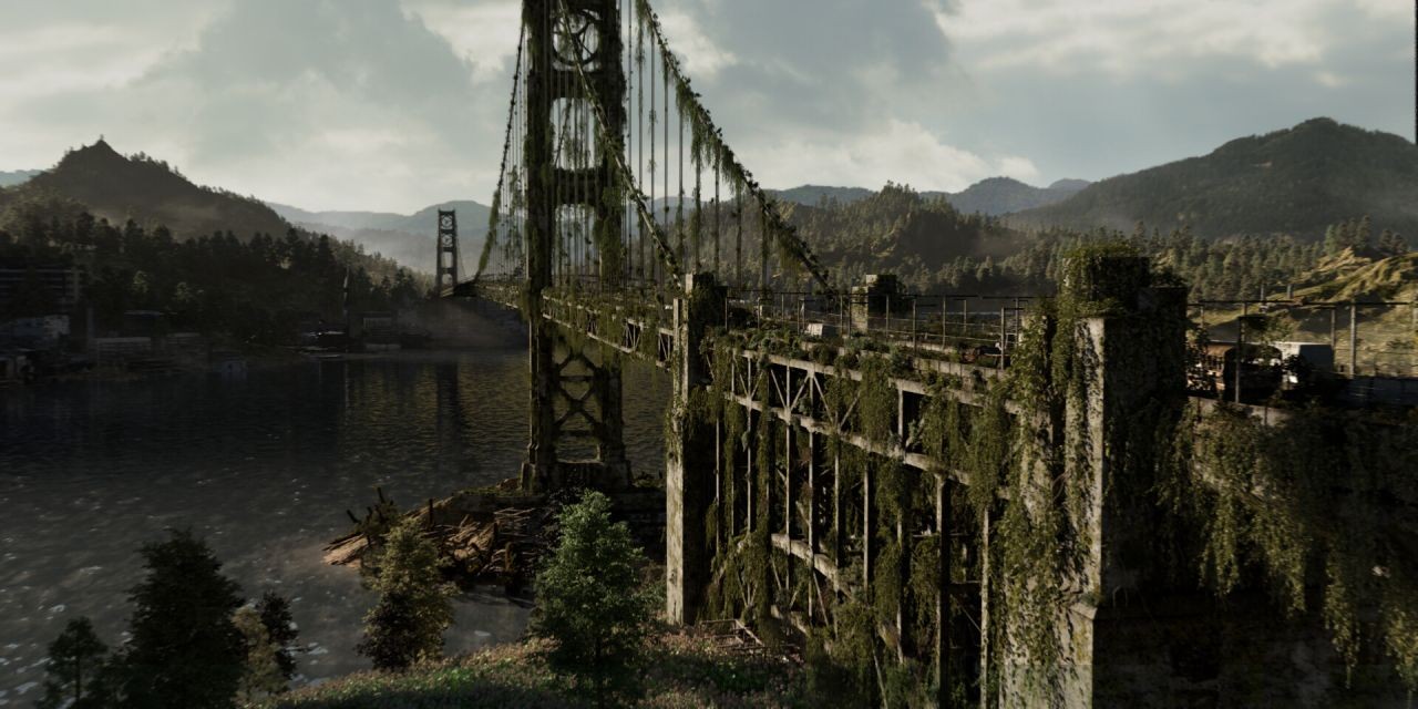 哲軒 & 佩珏:可以分成 CG 和數位繪景兩部分,在 CG 的部分上,是首次嘗試在 Blender 製作工廠基地的模型,並使用 Houdini 製作尖銳的巨石及地形。之後模型的 UV、Normal 及面數的統整都在 Houdini 中調整,以維持一致性。而角色部分則使用 Mixamo 一個很酷的機器人當基底,導出到 ZBrush 雕刻以獲得較精細的 AO、Normal map,之後再到 Substance Painter 繪製貼圖,以得到較為客製化的細節。最後使用 Unreal Engine 進行整合及燈光。數位繪景部分則是在 Unreal Engine 算圖後使用 Photoshop 進行天空、遠山等背景的繪製,並將 DMP 的細節導入到 Nuke 進行相機投影的製作(Camera Projection) 及最後的畫面合成和調色。