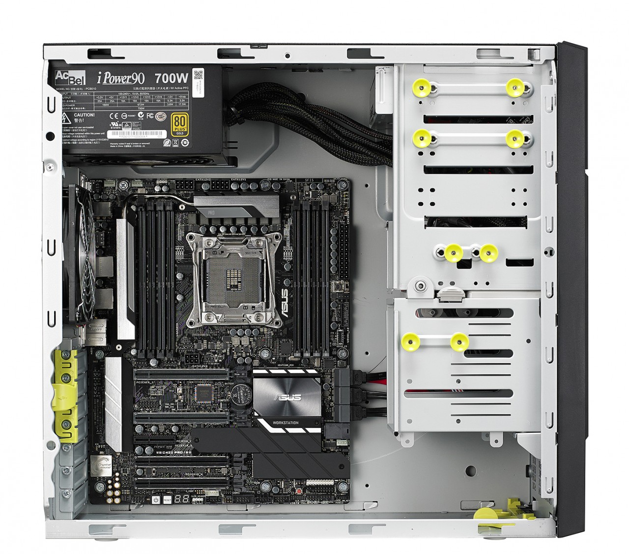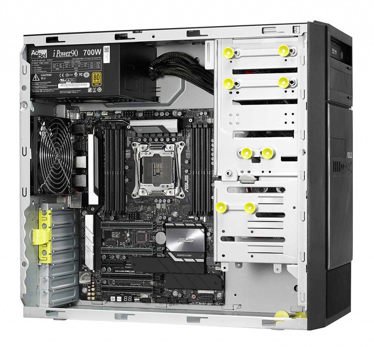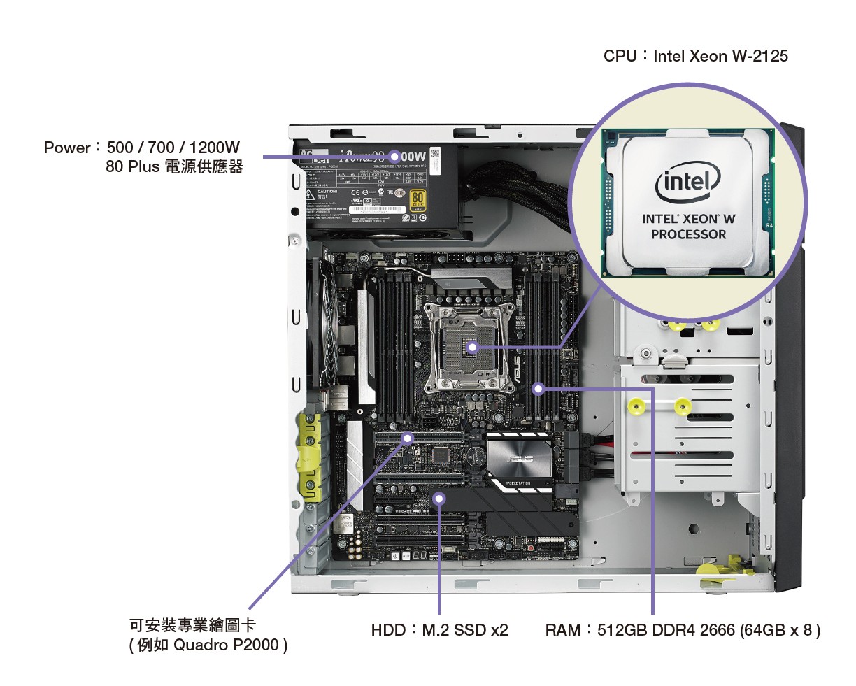 ASUS WS880T 可搭載 Intel ® Xeon ® Processors Skylake-W product family 處理器,使用 Intel® C422 晶片組,能支援最大 512GB 記憶體容量(64GB * 8),對於後製特效這種大量消耗記憶體容量的工作,也不會捉襟見肘。配備 2 x PCI Express 3.0 x 16 slot (x16 link)、 2 x PCI Express 3.0 x 16 slot (single @ x 16 link, dual @ x8/x8 link)、 1 x PCI Express 3.0 x 4 slot (x4 link),可輕鬆選配雙顯卡進行工作,還有空間可以安裝其他擴充卡。儲存方面除了支援六個 SATA36Gb/s 連接埠外,還可以安裝兩個 M.2 SSD,速度與儲存容量都能兼顧到。另外前面板提供 2*USB3.0、 2*USB2.0、耳機與麥克風插孔,後方面板則提供了 2 x USB 3.1 Gen2 ports (Type C & Type A)、 4 x USB 3.1 Gen1 ports、 4 x USB 2.0 ports、 1 x Optical S/PDIF Out Port、 2 x Intel LAN(RJ45) Ports(1GbE)、 8-channel Audio I/O Ports 等等豐富的介面可以使用。電源供應方面則可搭配 500W、 700W 或 1200W 80PLUS 電源供應器,確保在任何的配置狀況下能穩定供電。