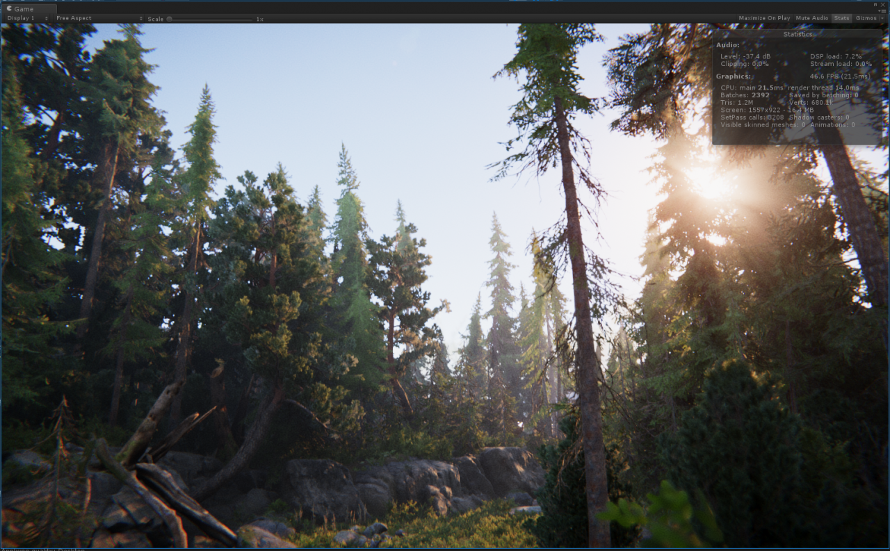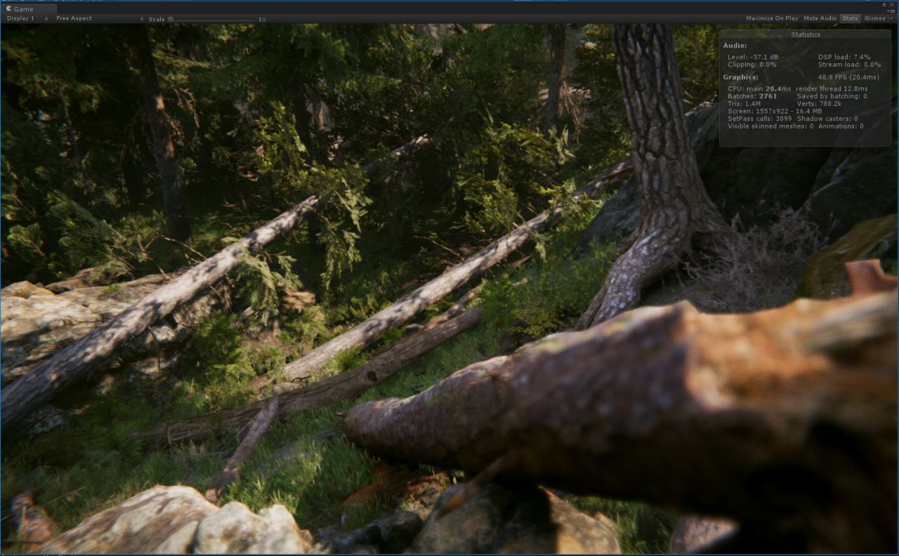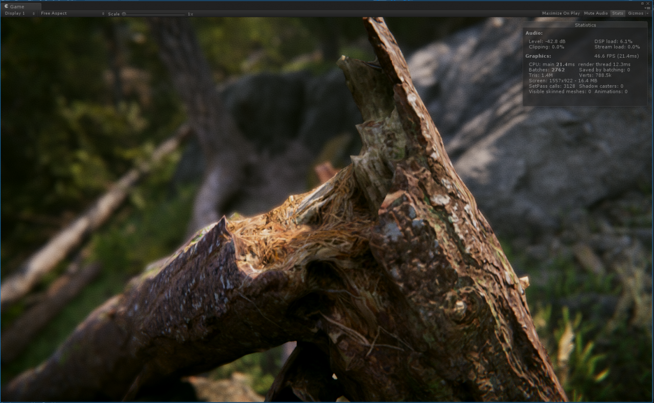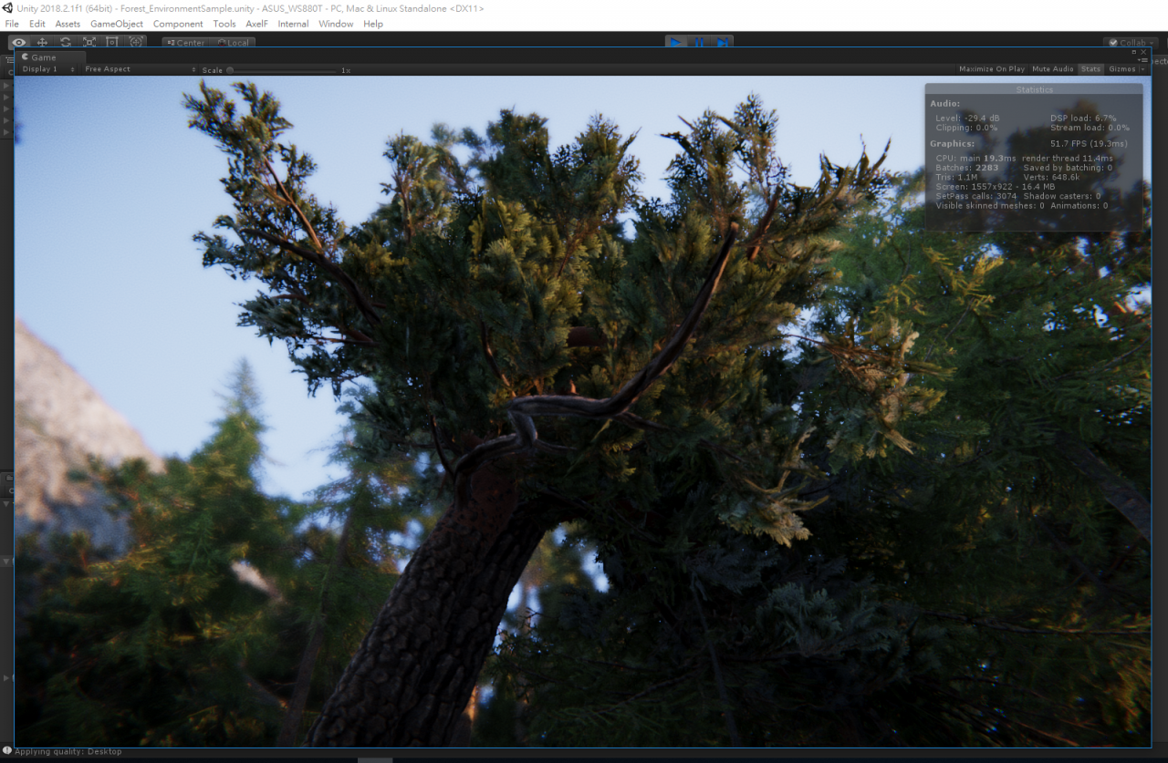 軟體平台要 Unity 2018.2 以上版本,場景可以在 Asset Store 下載的到,下載後只要執行專案中的場景即可看到神奇的畫面。這個專案場景為什麼可以這麼擬真呢?根據演講內容說明這些都是實拍回來的素材,透過 3D 掃描技術還原後,經過去除光源的手續後,才能得到宛如照片般的場景素材,而這些素材的模型與貼圖解析度都非常高,所以需要很夠力的硬體來支撐,在測試中我們可以看到,全螢幕模式下播放的螢幕更新率,都穩定的維持在 100FPS 以上,CPU 使用率都在 45% 左右,GPU 則是盡全力在工作。利用 ASUS WS880T 導入最新的即時渲染流程,加快整體動畫專案製作時程,還可以研發後續的相關互動式產品( 例如 VR、AR 或是遊戲),真是一舉數得。