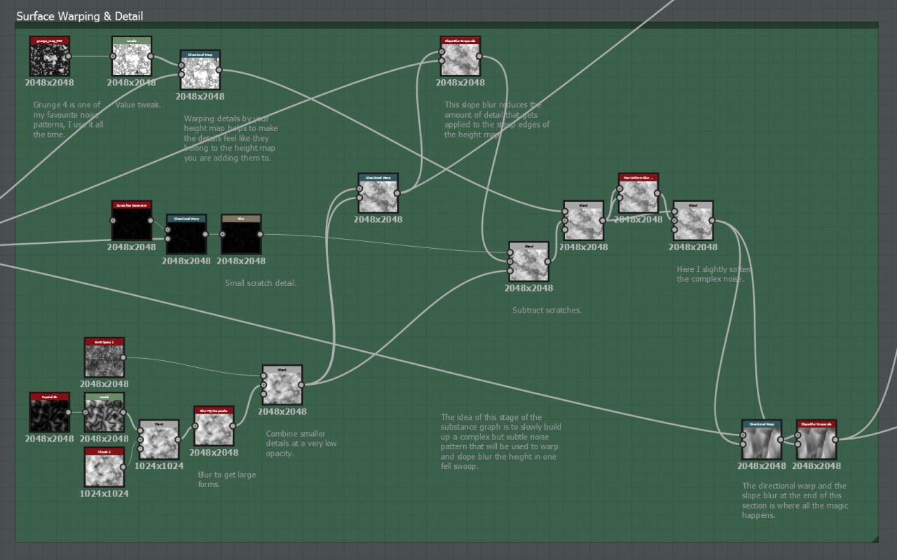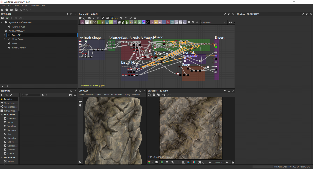 在製作 Book of the Dead 時除了使用 3D 掃描還原技術之外,也有使用程序性材(Procedural Materials),而製作程序性材質的業界標竿, 就是 Substance Designer 這套軟體,這套以節點式編輯的材質製作系統,讓許多苦手於寫程式這件事的設計師們,宛如溺水時見到救生圈一般, 再也不需要記一大堆指令,可以非常直覺就將材質製作出來。